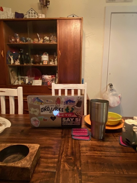 I wanted to share the kitchen table's image in my family's house because it has become my workspace and classroom. I have my laptop, water, and food in the image because the virtual college has become a non-stop task. As an undergraduate student transitioning to virtual learning, I have struggled greatly. The weekdays are filled with zoom classes, discussion boards, dozens of essays, and monotonous assignments that feel like busywork. Weekdays and weekends are the same. Universities and professors have maintained high expectations for students even though we are in a pandemic, economic depression, detrimental election year, and significant social justice movement.
