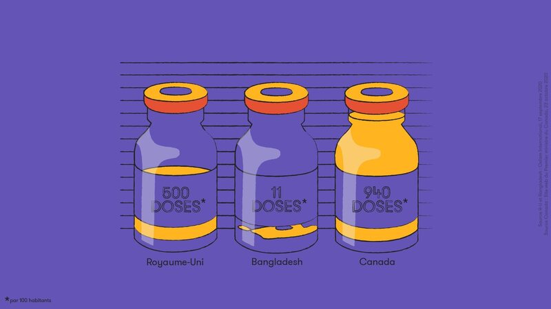 Translation of graphic: 500 doses* United Kingdom, 11 doses* Bangladesh, 940 doses * Canada *per 100 inhabitants