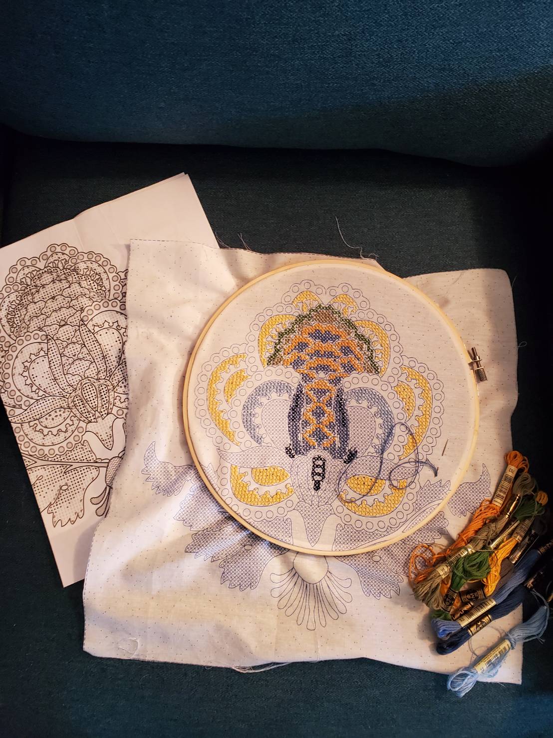 I've finished many smaller needlework projects during the pandemic to keep myself occupied. Recently I've taken on the bigger project of making a quilt. The quilt will be made up of quilt squares that have been cross-stitched. This picture is of one of three designs that decorate twelve squares. Since this is my first time doing such a project, my mom is helping. She is currently working on a square of the same design as mine. We don't know how long it will take to complete the quilt but we hope the pandemic is over by then.
