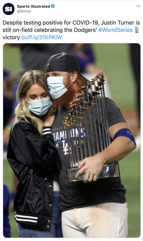 This photo was taken after the LA Dodgers won the 2020 World Series. Apparently this player, Justin Turner, found out he tested positive for Covid during the game, yet was still seen on the field after his positive test.