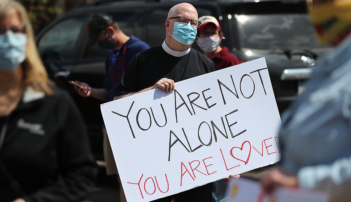 I found this image attached to an AARP article titled “How to Track COVID-19 Nursing Home Cases and Deaths in Your State.” The chaplain is holding a sign that reads, “You are not alone. You are loved.” The chaplain is expressing his faith through an act of service and love: supporting the frontline workers. It is a generous gesture, and one that I am sure resonates with the senior citizens at the care facility as well as their caretakers.