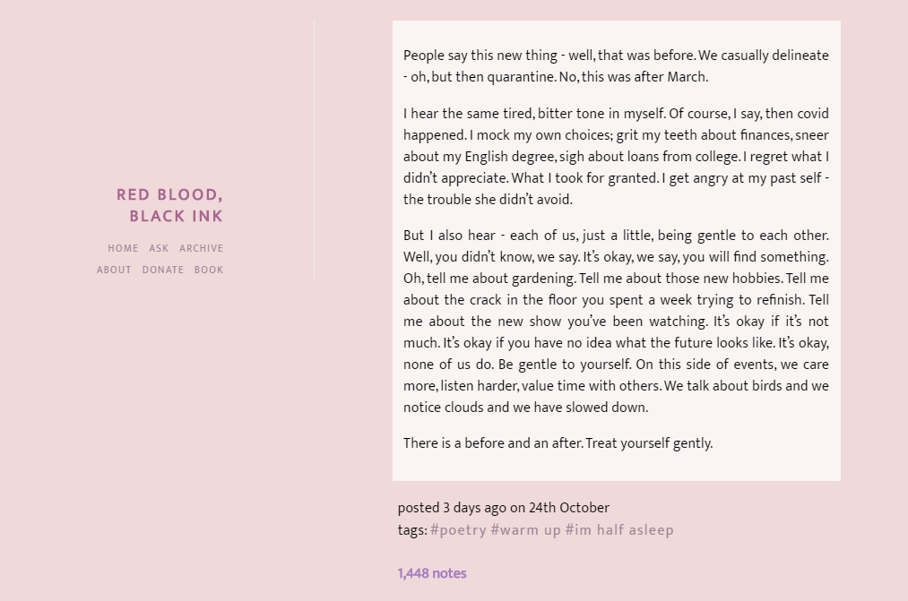 "There is a before and an after. Treat yourself gently." - Red Blood, Black Ink