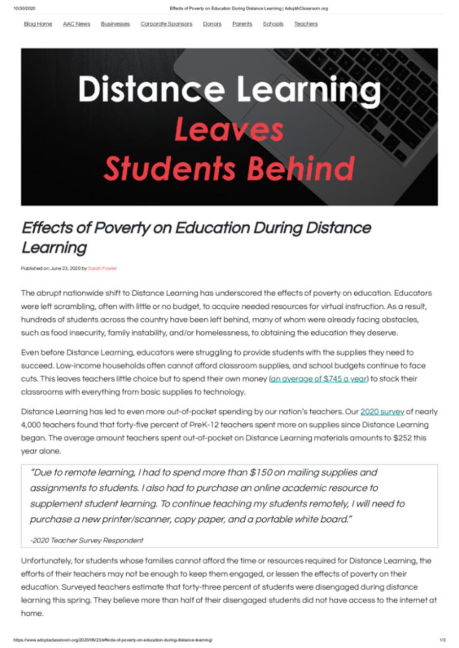 This article puts in perspective the effects of distance learning on families at or below the poverty line. Many students in poverty with food insecurity, family instability, and even homelessness are also lacking a quality education due to the pandemic and virtual learning. Along with these already existing problems, these students also lack some of the necessary requirements to learn at all including internet access and availability of technology. This is leading them to fall farther behind than they already were.