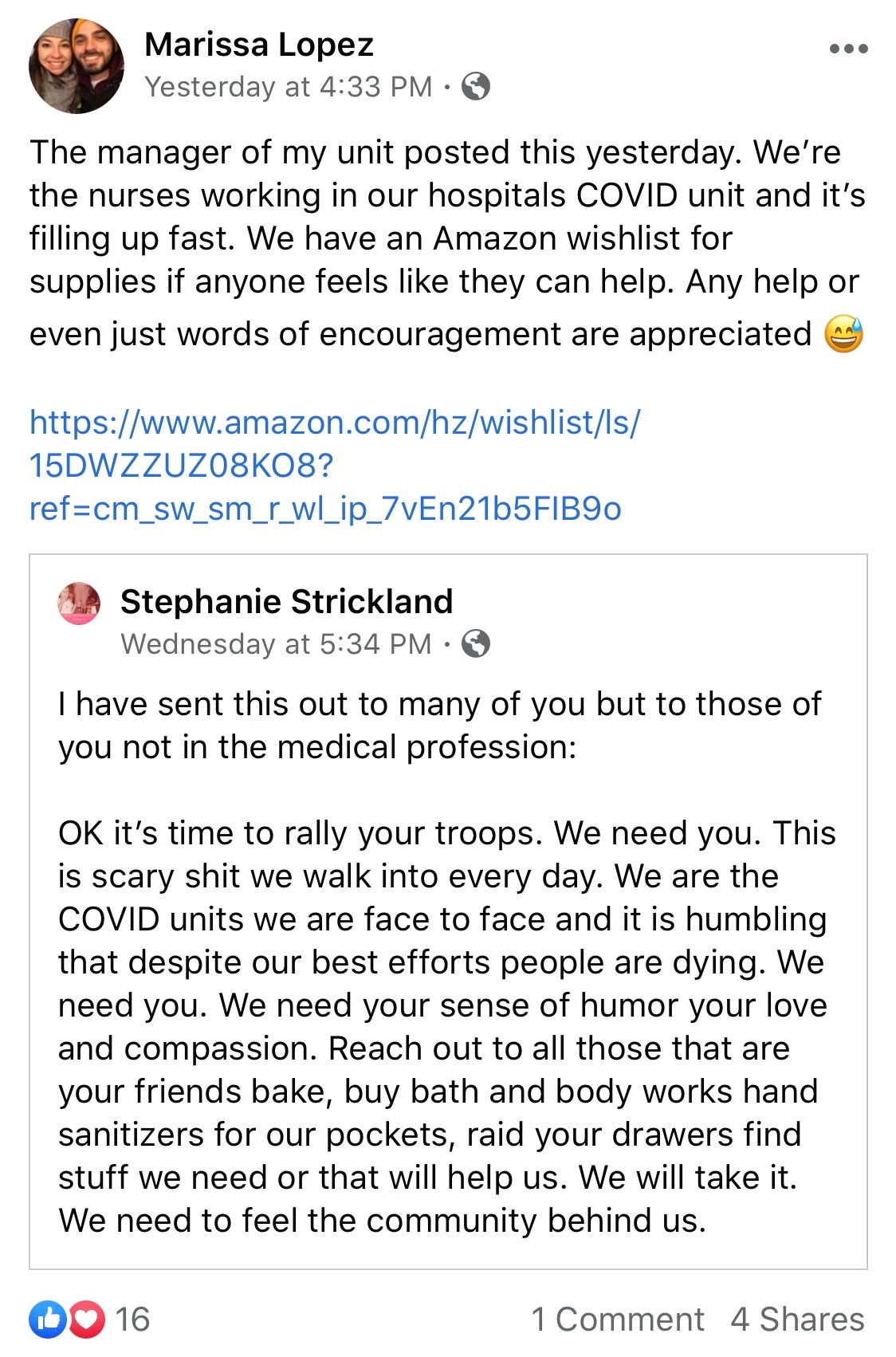 This is a cry for help that my sister and her manager posted on Facebook. This came at a time when nurses were running on empty as far as supplies were concerned. They needed anything they could get their hands on. The panic caused by the virus led to people hoarding PPE and essentially taking it from the hands of the people that really needed it. Because of that, the nurses needed to reach out to anyone that would listen. They sent a message to the community asking for help and putting the list of items they were short of in the amazon wish list. Thankfully within days they were able to get enough supplies to last them a few weeks but they are still reliant on the community.