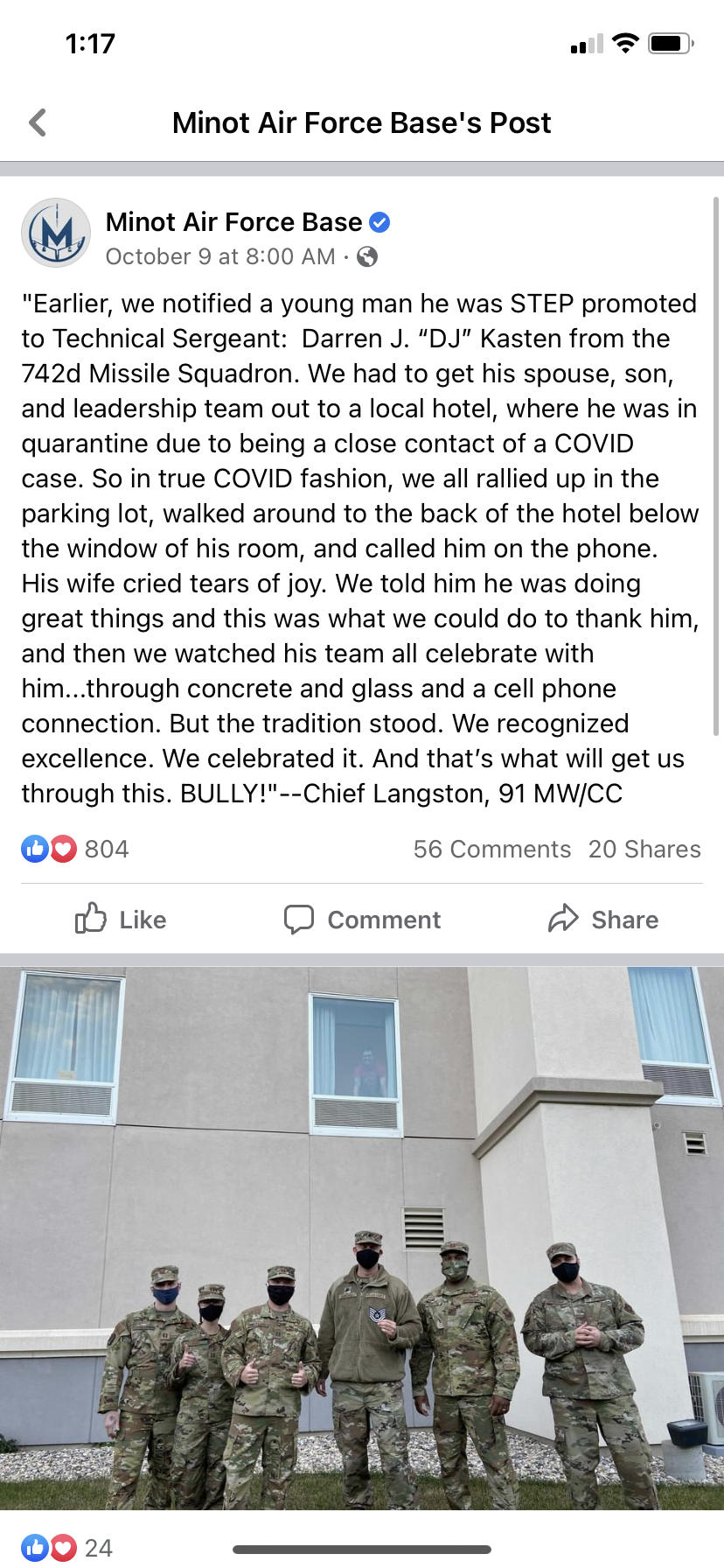 CCMSgt Langston and other members of leadership surprised SSgt. Kasten with a STEP promotion to TSgt. outside of his hotel room, where he was being quarantined. Minot AFB in Minot, ND has been battling the pandemic and its effects on morale among the Airmen. This story represents the comradery associated with military members and keeping traditions alive.