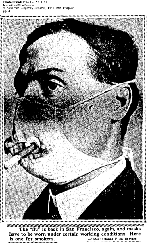 The artifact that I have chosen is a photo of a man wearing a mask, with a hole provided so that the wearer may smoke a cigarette without having to remove said mask. The photo appears in the Saint Louis Post on February 1st, 1919, and the accompanying text seems to imply that it may have been taken in San Francisco, as the city is mentioned in particular. Additionally, the descriptive text is followed with "- International Film Service", implying that the image and text originate from this organization.