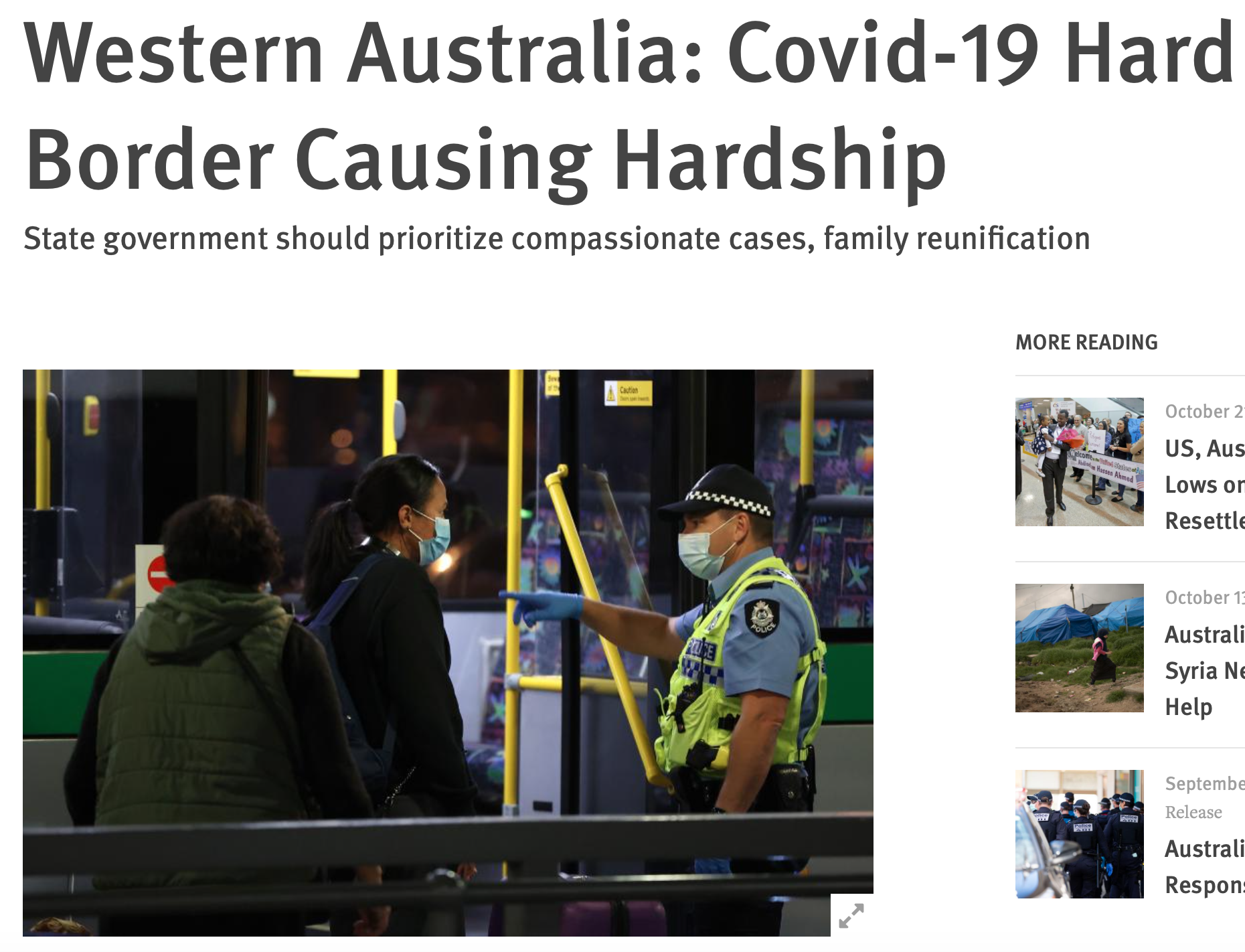Western Australia's "Hard Border" has prevented many people who live in the state from returning home. Australians wishing to enter the state must apply for travel approval called the “Good to Go process” with the police. Very few are permitted to enter, and those that do must also self-quarantine for 14 days.