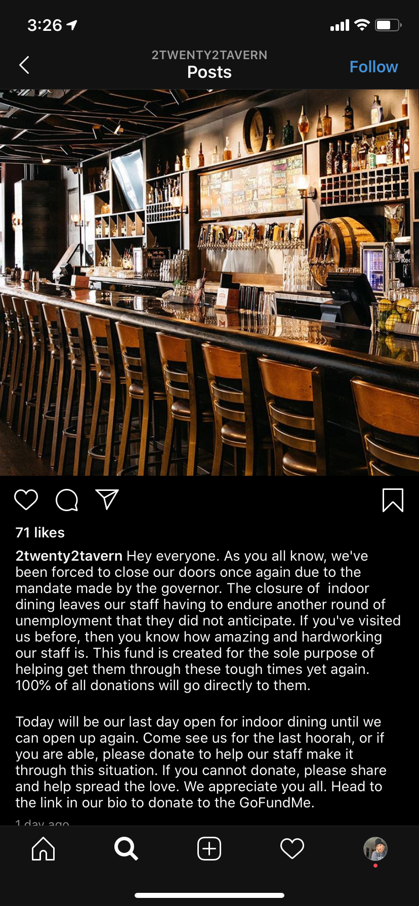 This is a screenshot of a social media posting by the restaurant 2twenty2tavern. They are forced to close because of a mandate made by the governor to not allow indoor seating. As the summer months come to a quick end many restaurants are left with the question what can we do?