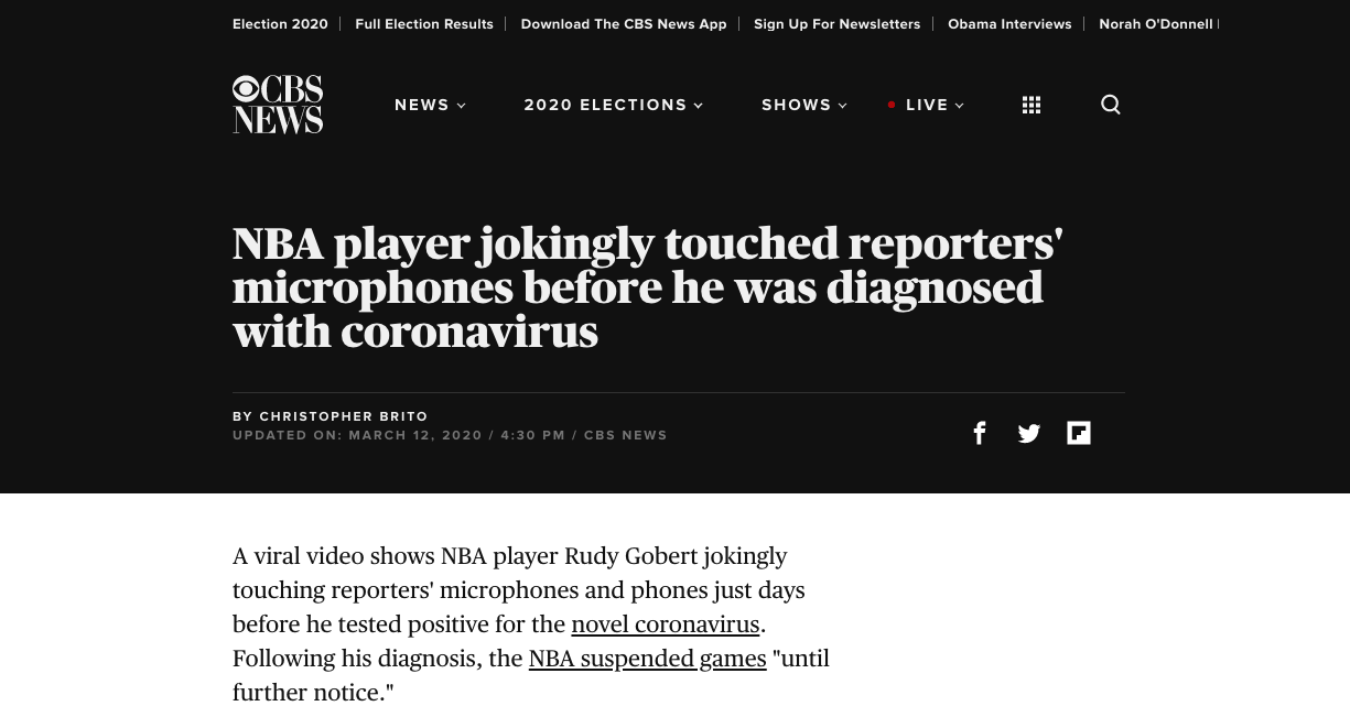 The NBA was considering a stoppage of games due to the outbreaks of COVID-19. During one of the press conferences a player named Rudy Gobert decided to touch all the microphones in the press room after speaking with reporters, within days the world learned that he had contracted Covid-19 and the sports world began shutting down all sports, including NCAA tournament and all sports around the world. Gobert was one of the first celebrities to contract COVID-19.