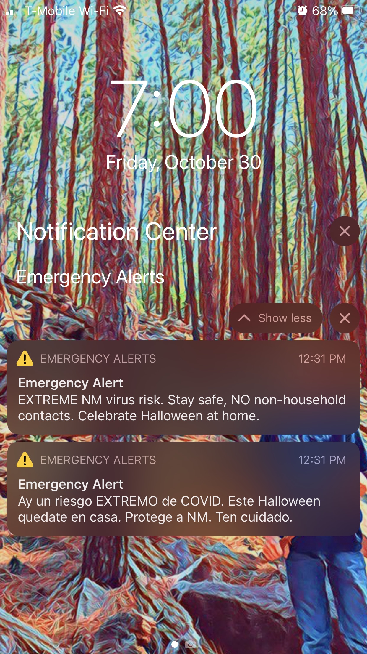 This is a screenshot from my phone from this afternoon. I live in Colorado, but depend on New Mexico for several things. I made a quick trip to Target today, and while in the checkout line, everyone’s phones went off.