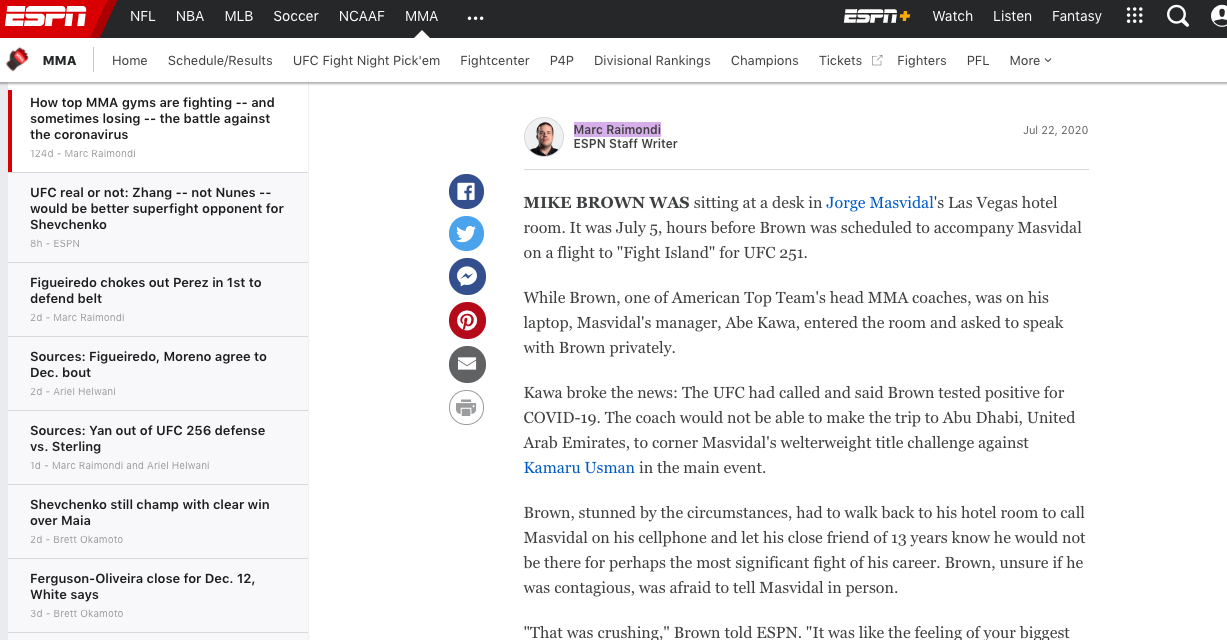 This article shows the difficulties and last minute changes that professional MMA fighters are facing during this pandemic. I remember seeing the cancellations mentioned in the article as well as others. In MMA there is always a feeling of never being sure if a fight will go through until the weigh-ins are done because of the possibility of injury. The pandemic and the virus have added another possible cause of cancelation for fights. One that the fighter may have no control over.