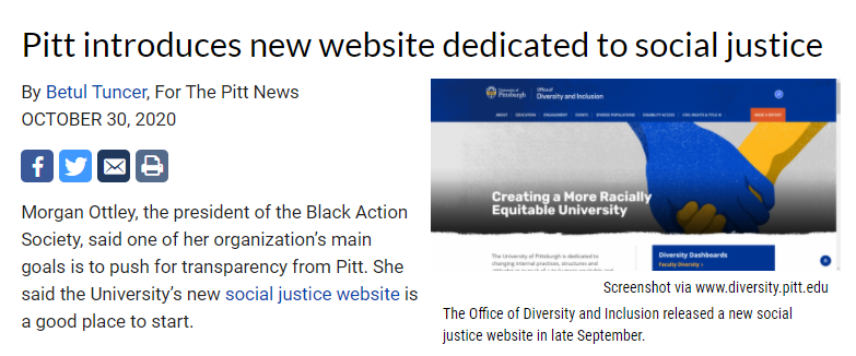 This article demonstrates the active voice of Black students to access diversity and social justice at the University of Pittsburgh (Pitt). The website's creation is a way for students to actively notify Pitt of any kind of social bias shown. Protests for social justice across the nation have acted as a catalyst for Universities to become more aware of social justice reforms within their institutions.