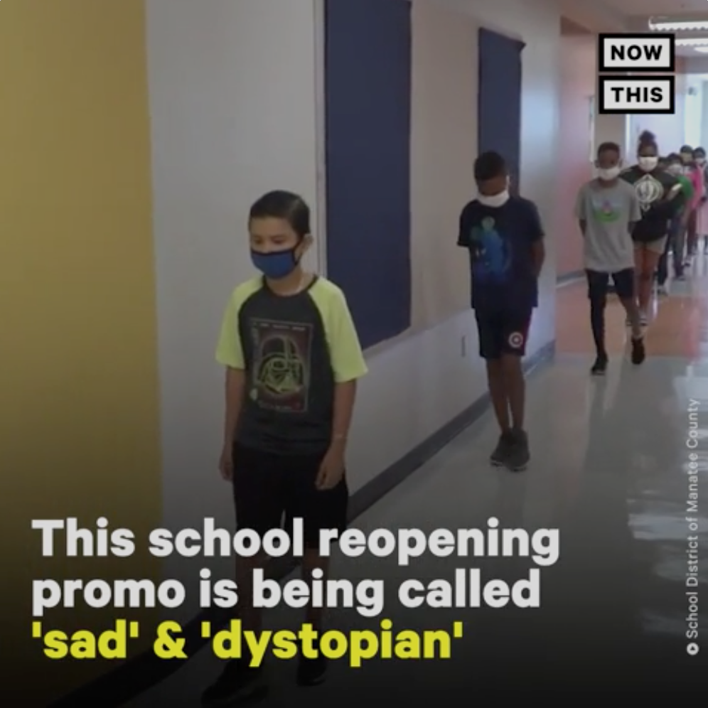 This video is from Now This News and uses footage from the School District of Manatee County in Florida. The footage was for promotional material the school district released in July 20202 for what it would look like in August to have their schools be re-opened. The video mentions the controversy between parents and schools and professionals that want to wait for in-person teaching to resume.