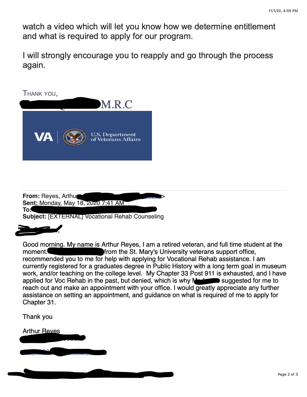 This is an email shared between me and a VA representative in the middle of 2020. Communication during the Covid-19 pandemic, and summer vacations was making things tough to complete. With the start of these events I was hoping for financial support for my summer II class.