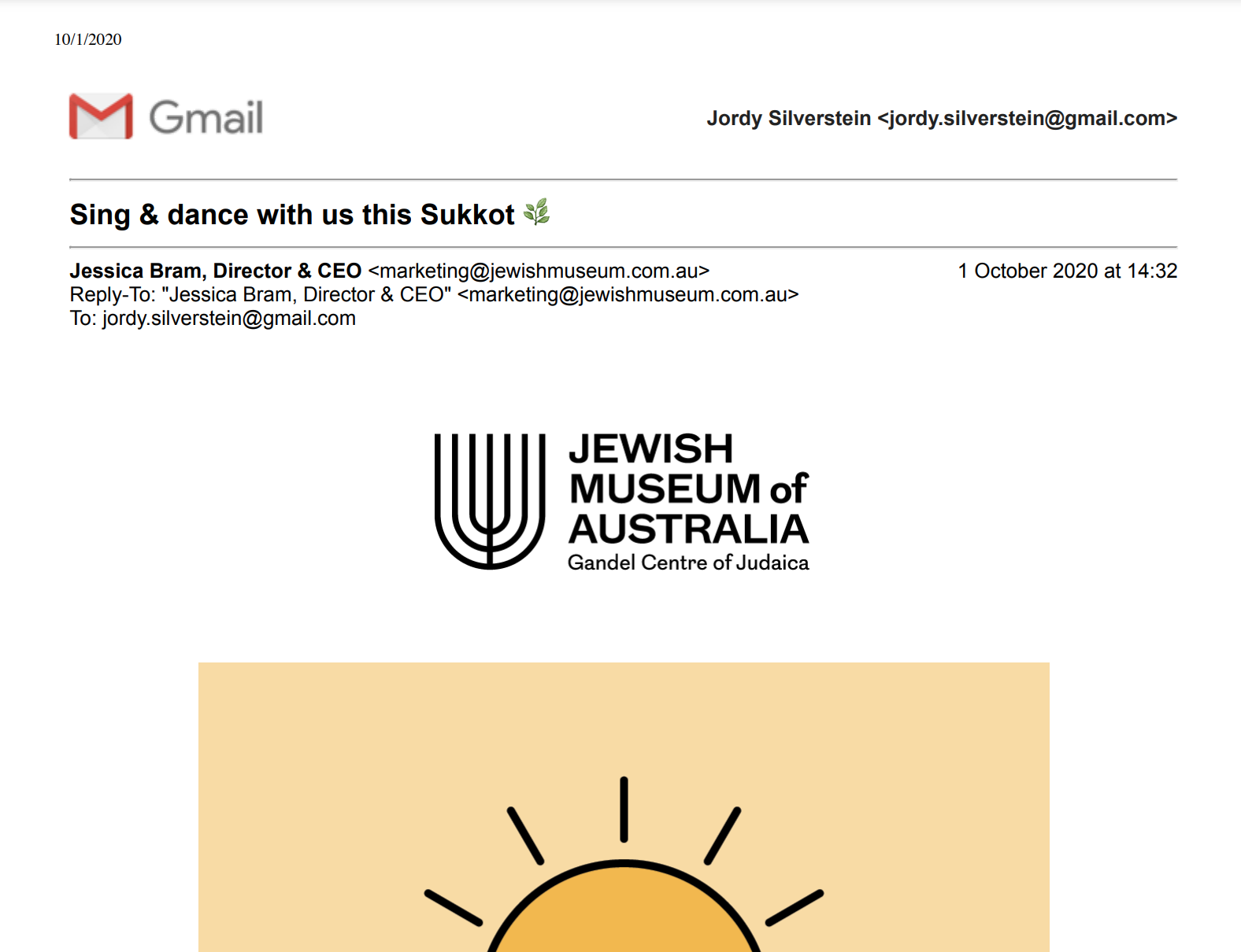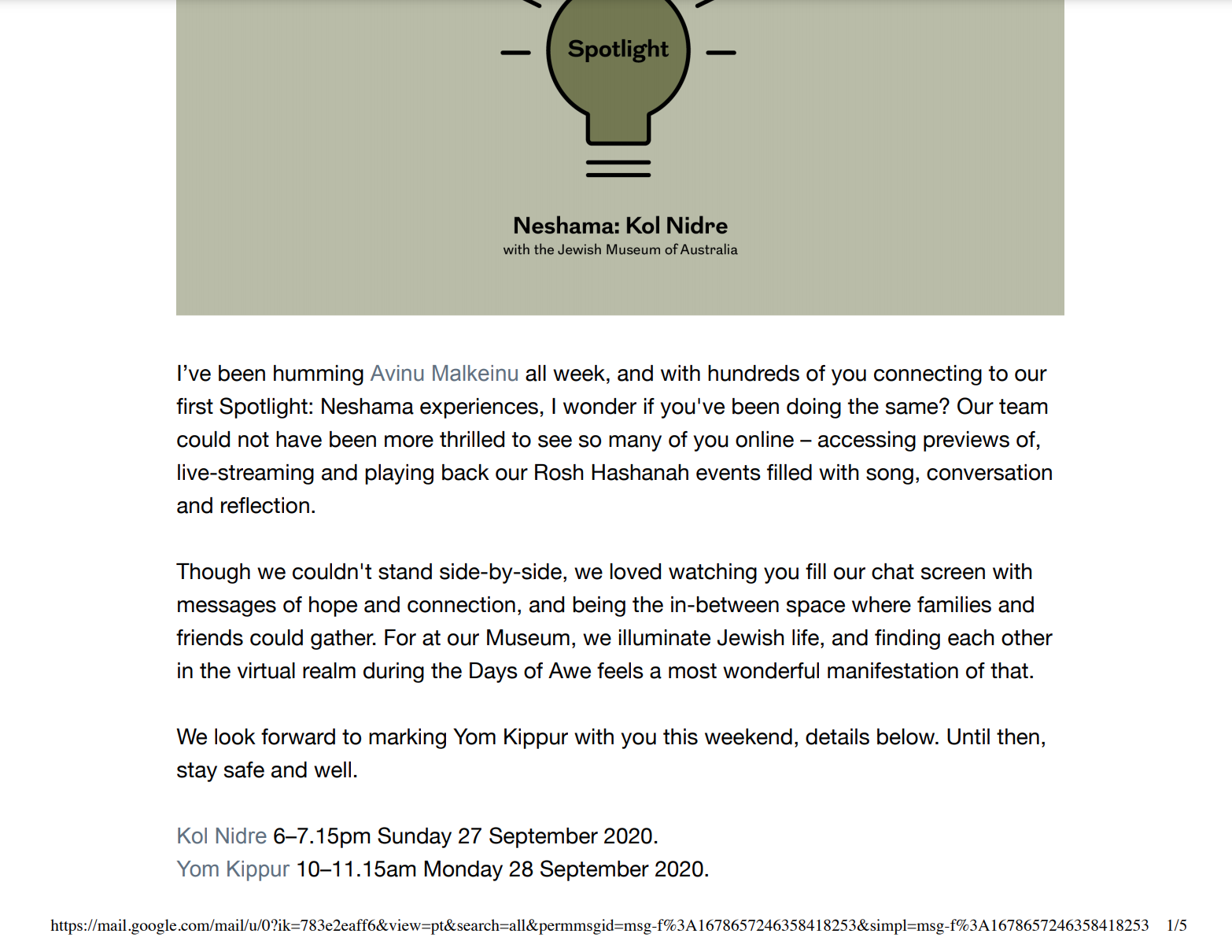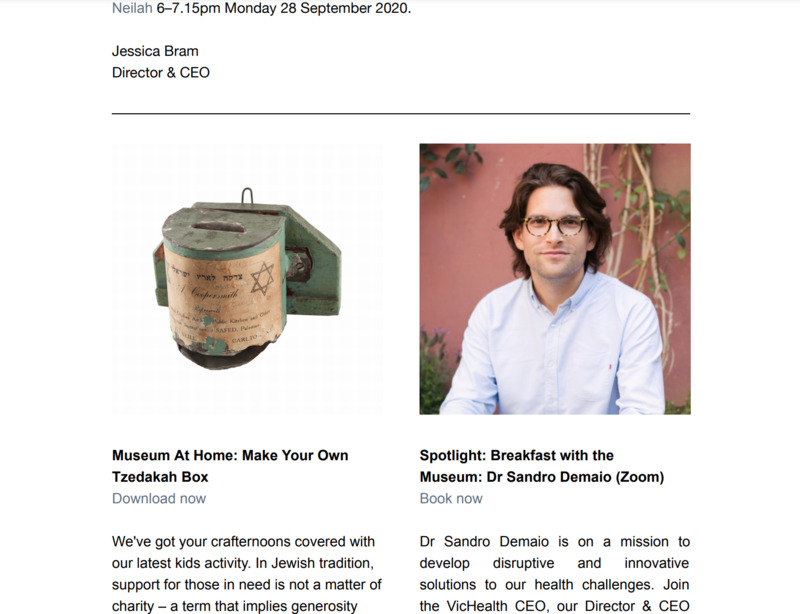 With the Covid lockdown in Melbourne, the Jewish Museum of Australia had to close its doors to visitors. In response, they moved activities online, organising events to be held virtually. These events were shared with members of the Museum community through their email list.