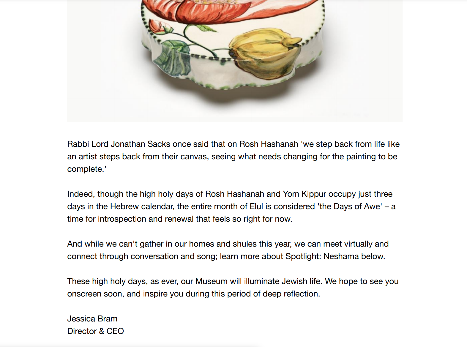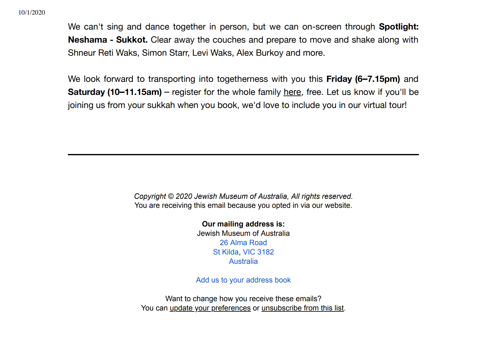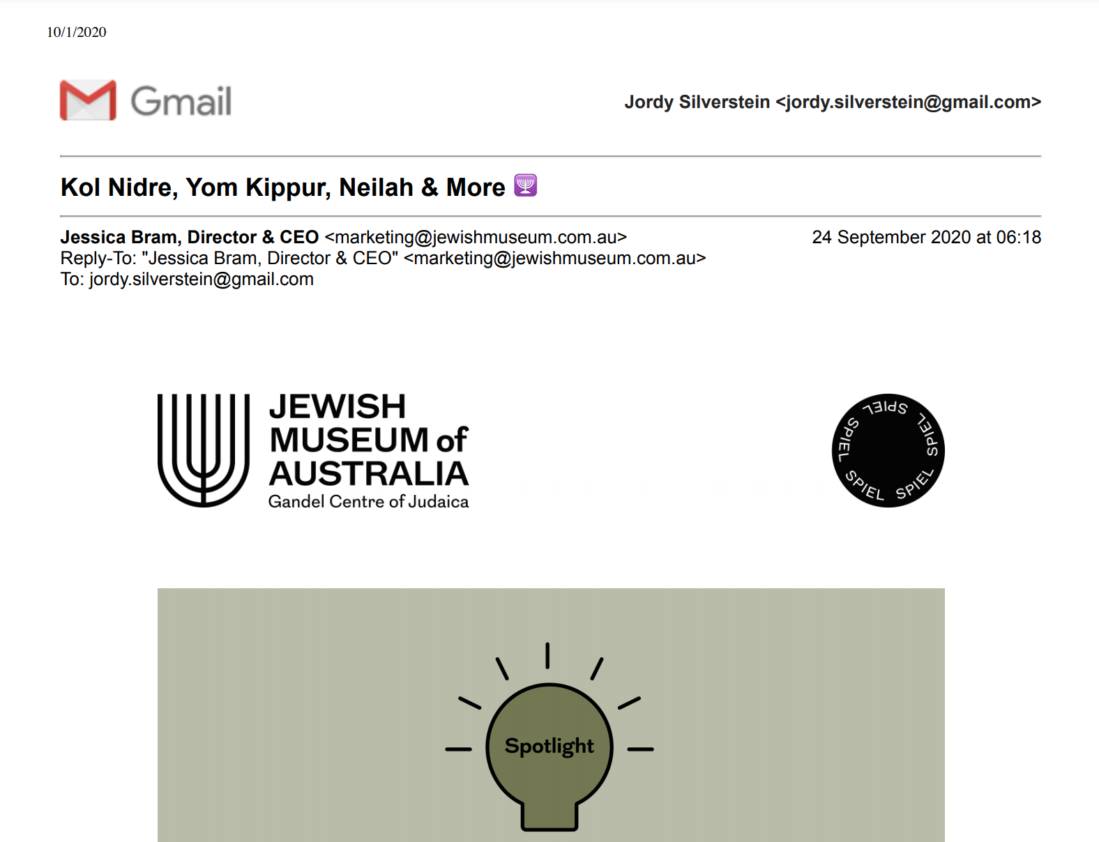 With the Covid lockdown in Melbourne, the Jewish Museum of Australia had to close its doors to visitors. In response, they moved activities online, organising events to be held virtually. These events were shared with members of the Museum community through their email list.