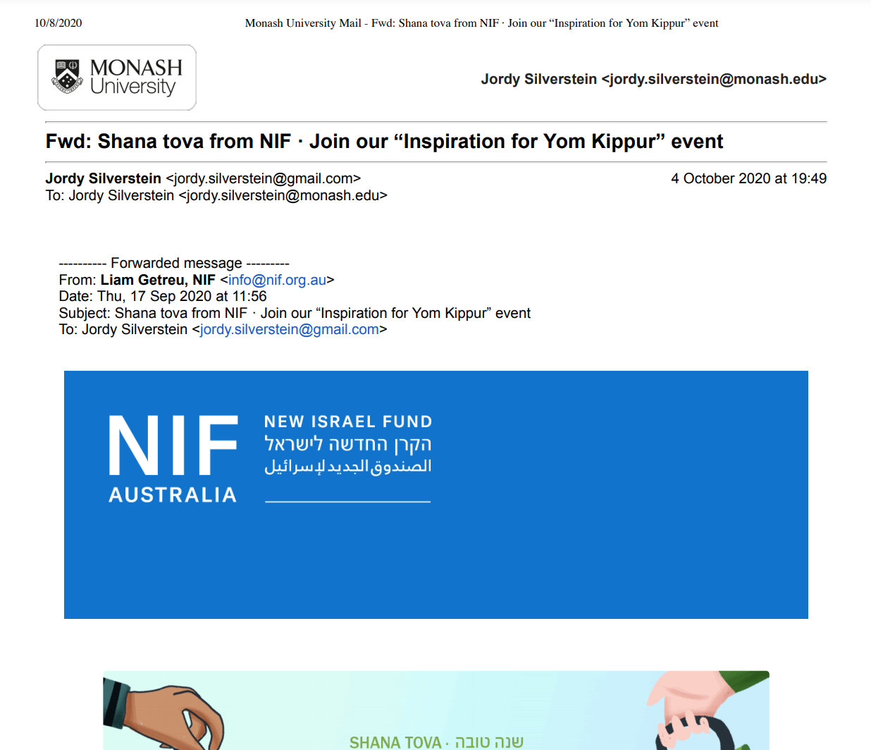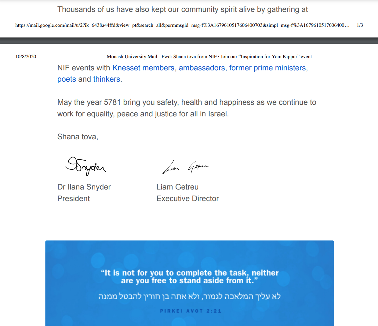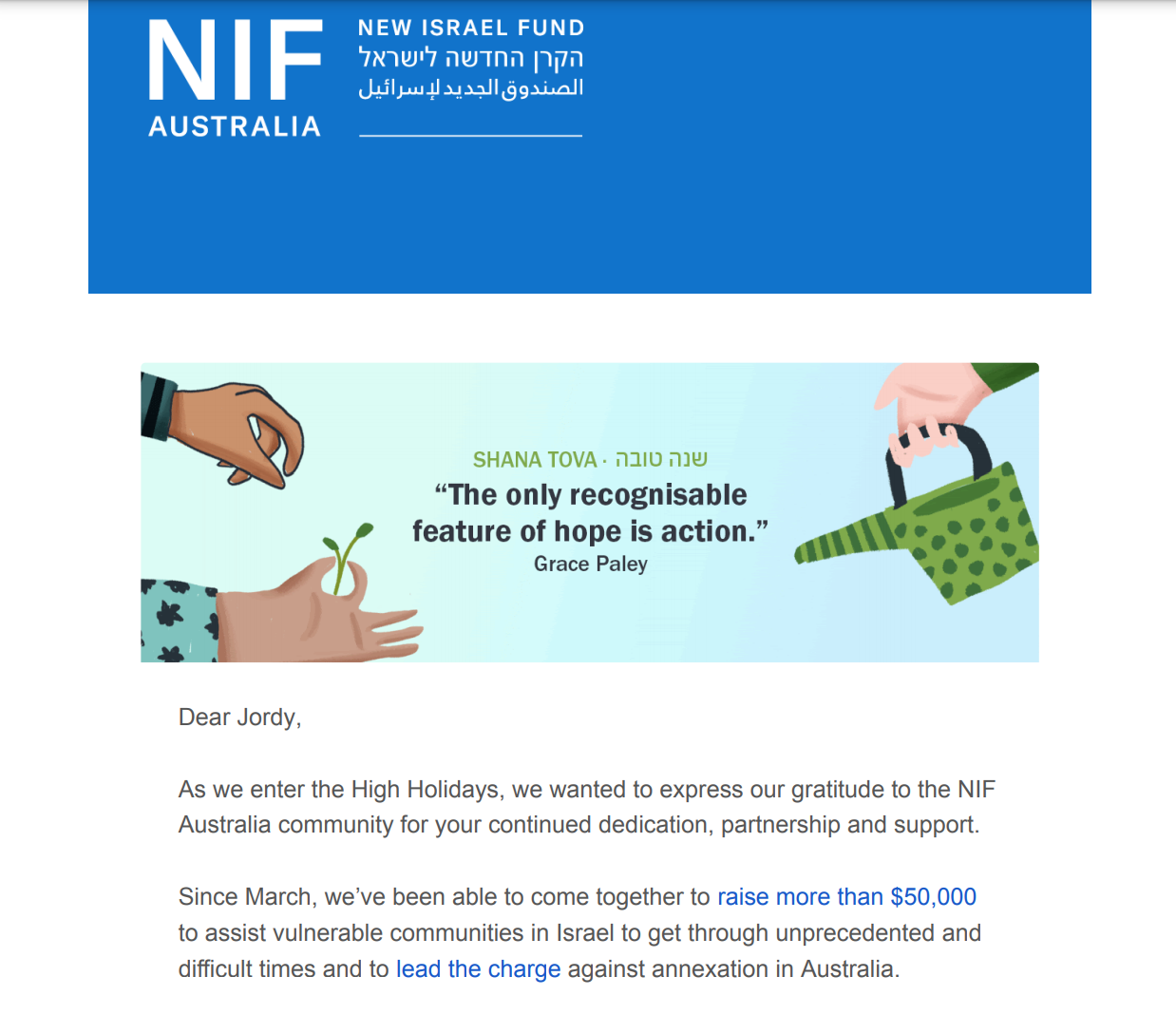 New Israel Fund emailed their email list in order to wish them a shana tova, and to send details of an event for Yom Kippur, as well as general information about what the organisation had been doing