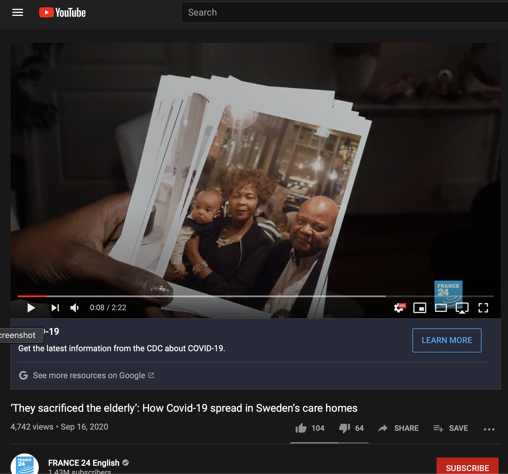 A news clip that discusses how Sweden has abandoned the eldery in the time of a pandemic. Sweden is considered a first world nation and somehow it has abandoned its own seniors during a pandemic to fend for themselves.