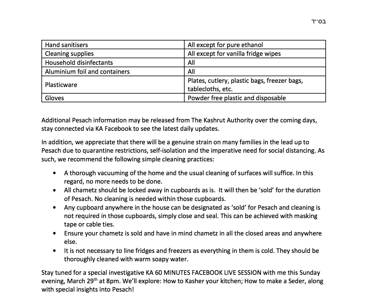 Jewish Melbourne: SPECIAL KA GUIDELINES FOR PESACH 5780 - 2020 DUE TO COVID-19