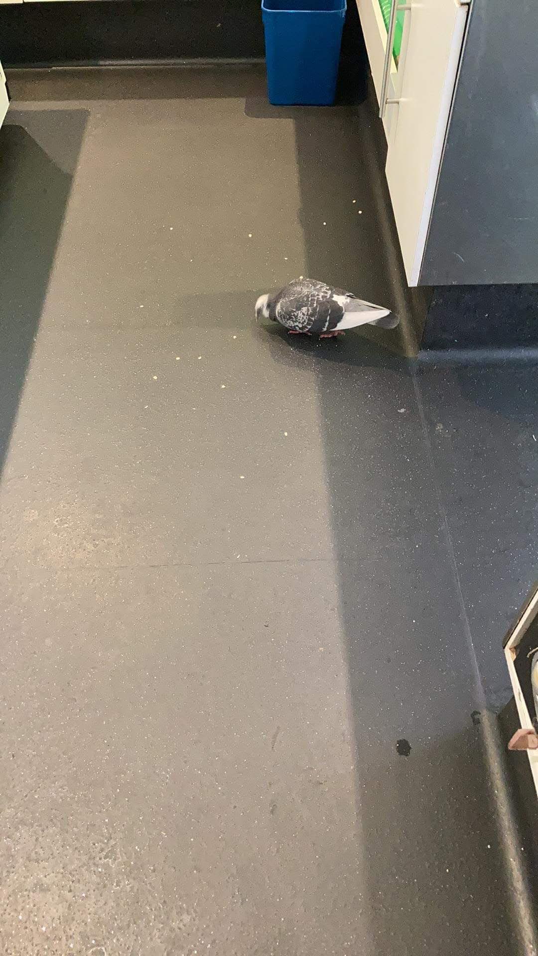 Despite quarantine restrictions, I was still able to work at my fast food job in the CBD. Pictured here is a pigeon who would come into our store looking for food in the quietest parts of the day, which were almost always due to the lack of people in the city. Whilst working in the city, I realised that most urban birds, including pigeons and seagulls, became very confident during the stricter quarantine periods. The lack of activity in the city meant they were not receiving the usual scraps they would receive from those travelling to and from their desk jobs. The birds became bold with their interactions with those who were coming to the city in order to gain the small amount of food they needed to survive. This small pigeon in our store is a good example of this. He would waltz in and munch on the oats that would land on our floor before we had time to clean them. Despite repeated attempts to shoo him outside, he would often walk around our floor before meandering outside again.