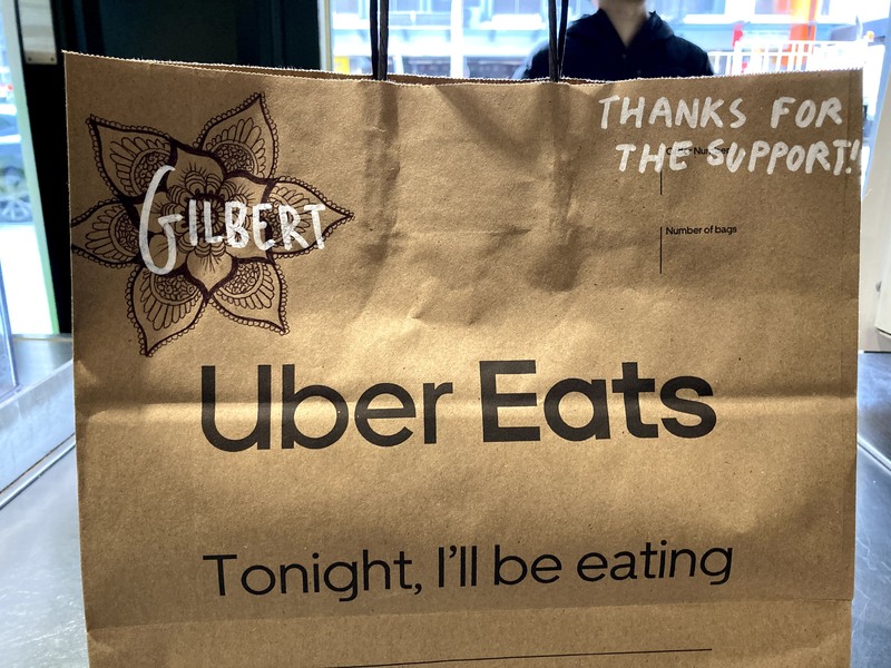 Restrictions meant many food shops in the city, like the one I worked at, received barely any customers during the harshest periods of quarantine. The 5km rule meant not many people had access to our location, whilst most of our customers who usually worked in office jobs in the city were also tasked with working from home. Our main source of income became the multiple delivery platforms my boss installed in our store. To both fill the quieter periods in the store, and to show the customers who ordered via these delivery platforms how much their business meant, my boss tasked everyone with decorating Uber bags and writing nice messages to customers. In this photo, you can see a design my colleague drew on an Uber bag, which was later used to carry Gilbert’s food. This small act connected both customer and business and showed our appreciation for the customers support of our small business.