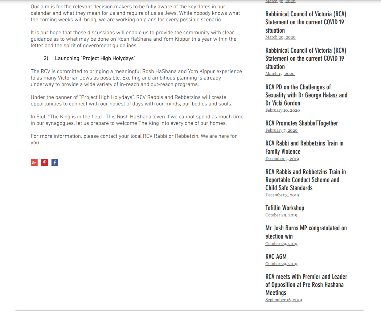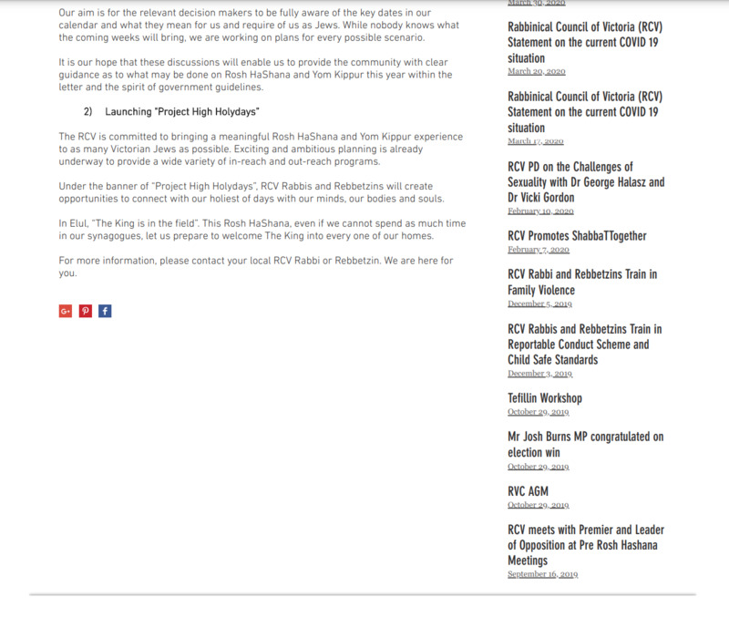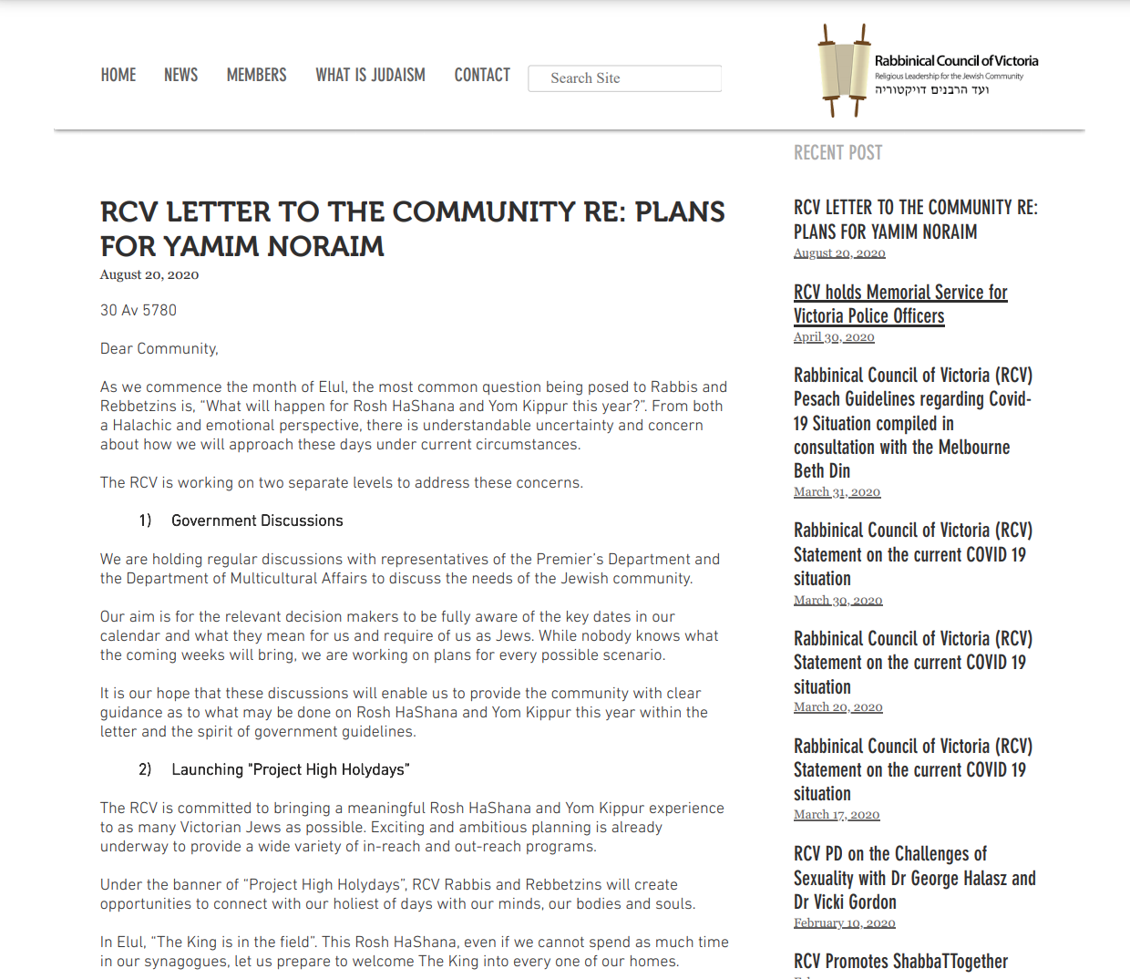 In August the Rabbinical Council of Victoria wrote to community members about the plans being made for the Yamim Noraim (High Holy Days), explaining the conversations that were happening with government as well as the launch of Project High Holy Days, to accomodate the community's needs.