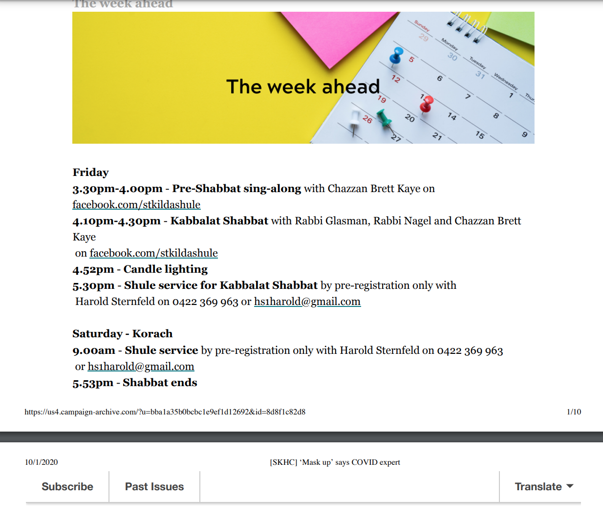 In this newsletter update, information is provided about online activities within the Congregation's community, including about a special event that took place that discussed mask-wearing for Covid-19, with Dr Norman Swan.