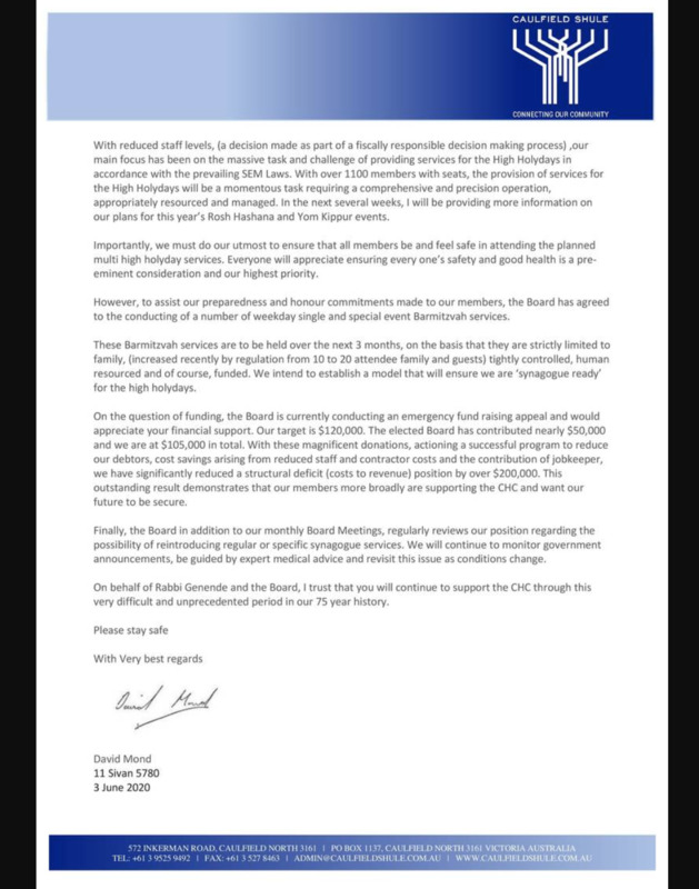 Jewish Melbourne: Caulfield Shule letter regarding opening up