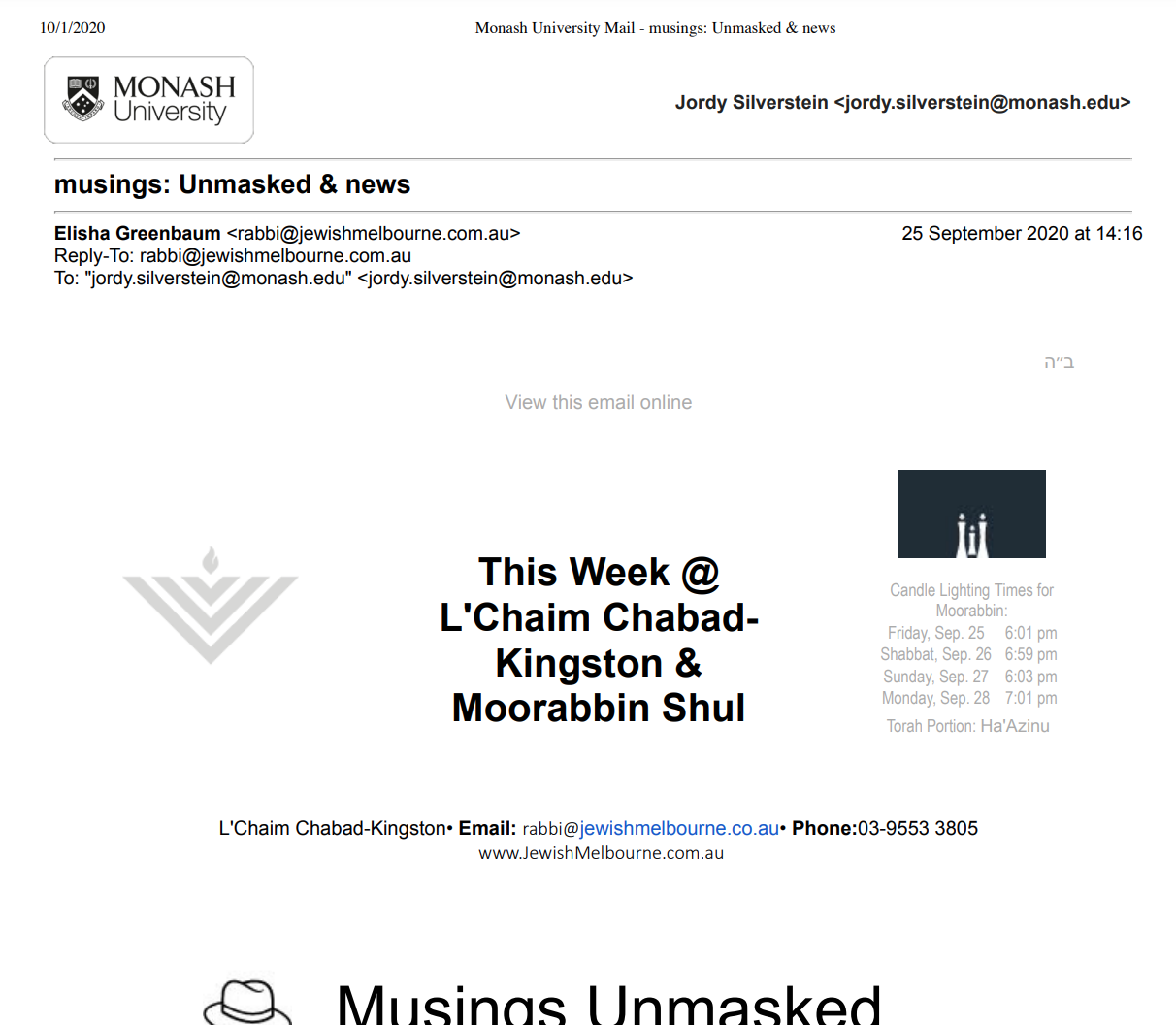 Jewish Melbourne: Chabad Kingston & Moorabbin newsletter 25 September