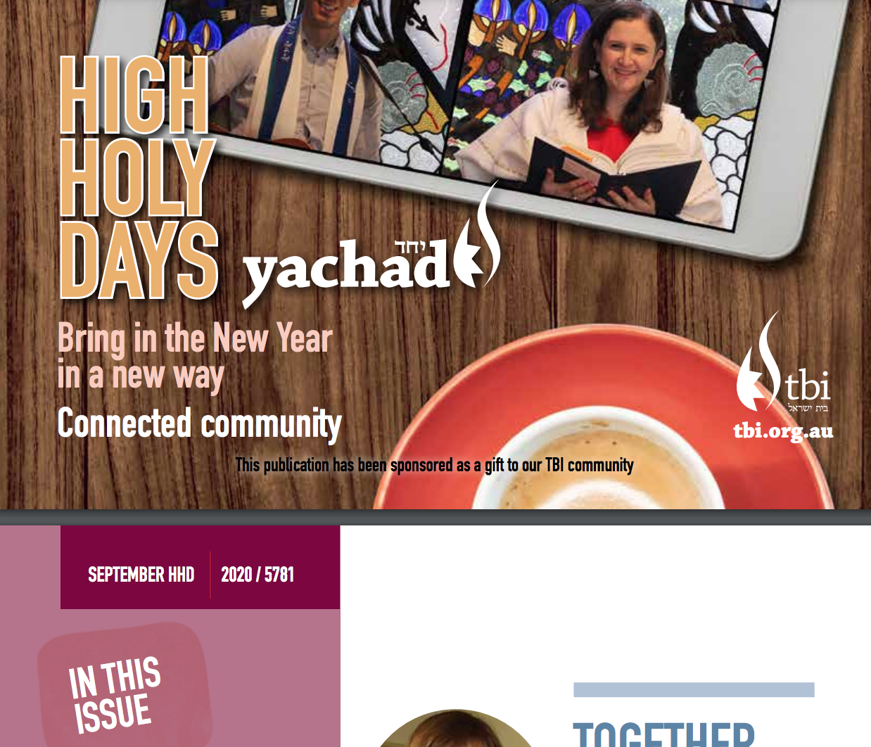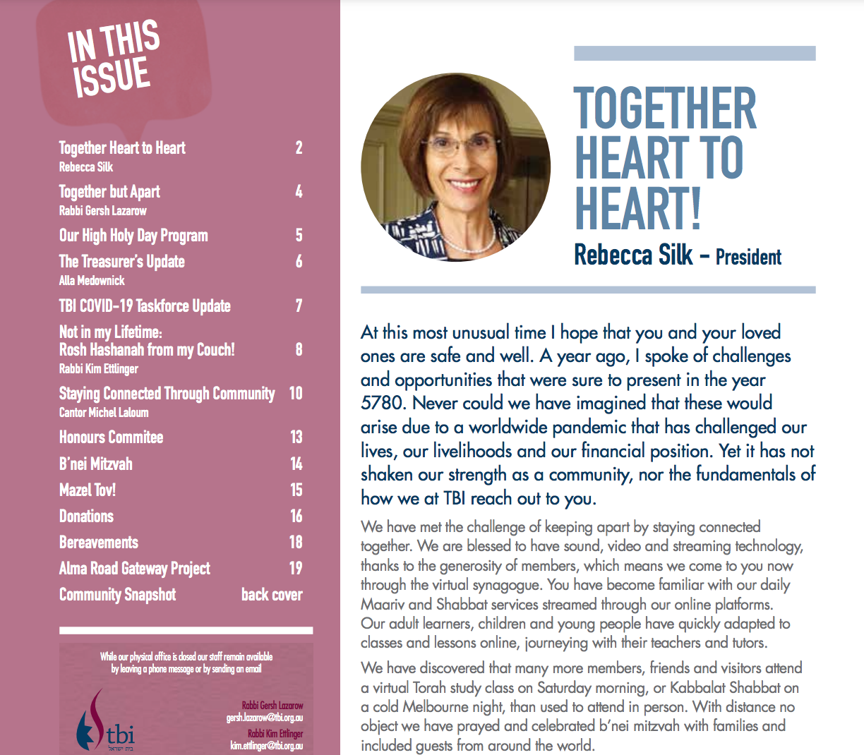 Temple Beth Israel's September newsletter, addressing the High Holy Days, online activities, and ways that the community is making meaning and staying together during Covid-19