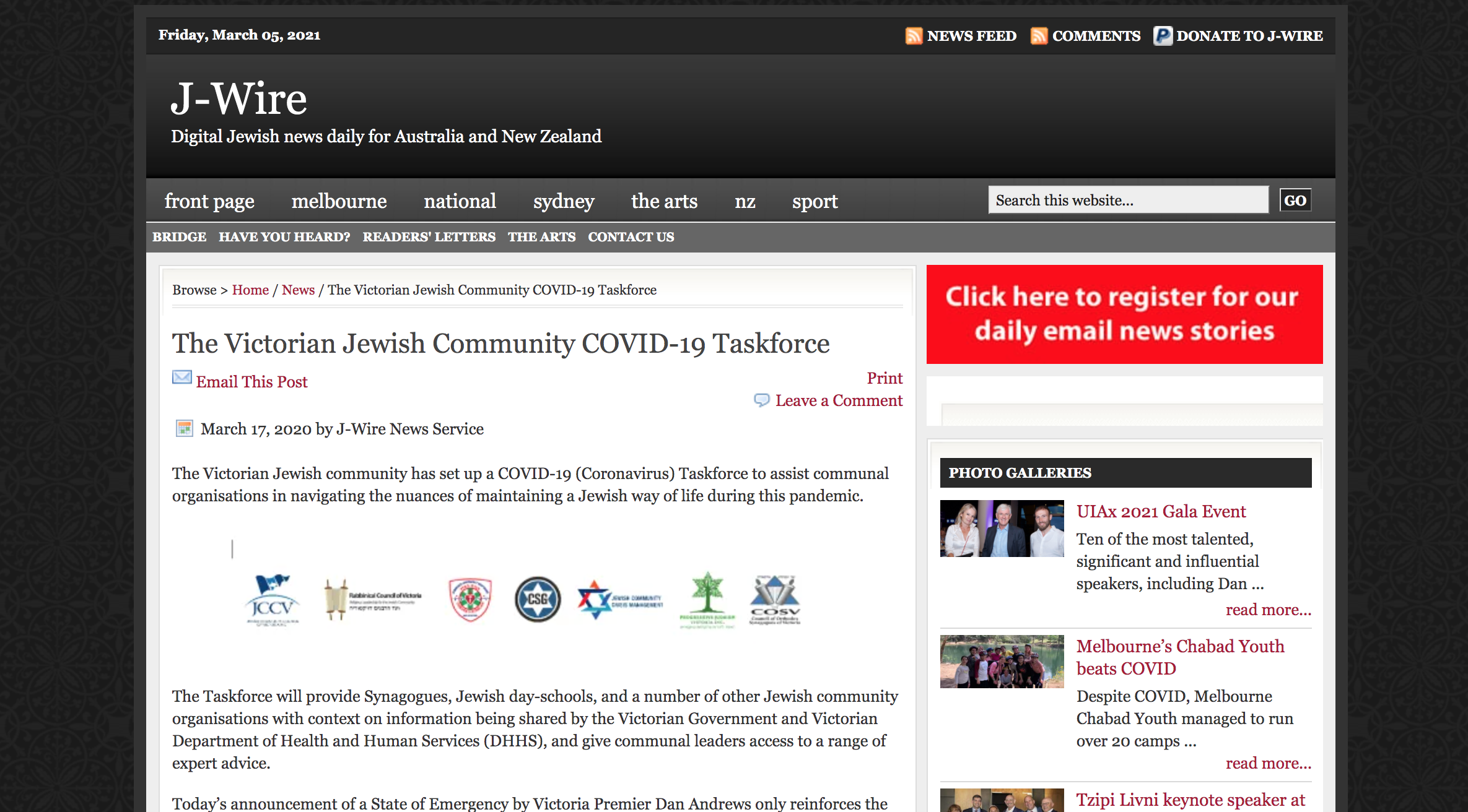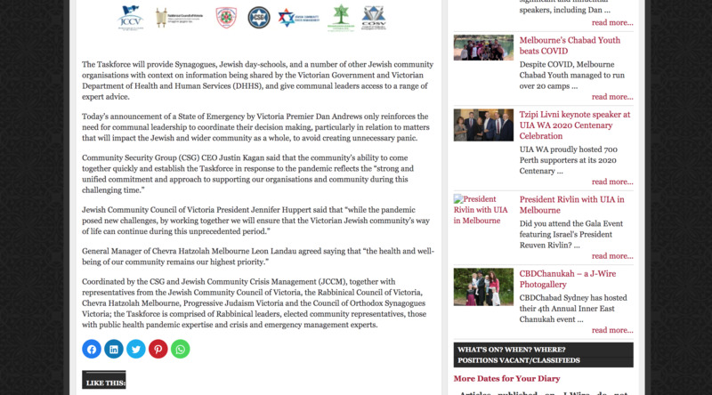 J-Wire published an article about the launch of "The Victorian Jewish Community COVID-19 Taskforce"