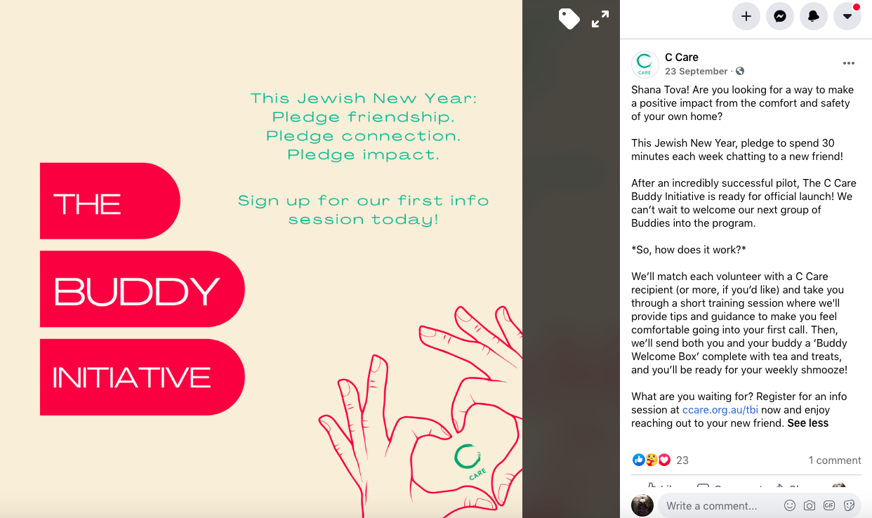 Around Rosh Hashanah, CCare established a buddy program during Melbourne's lockdown: "Shana Tova! Are you looking for a way to make a positive impact from the comfort and safety of your own home?