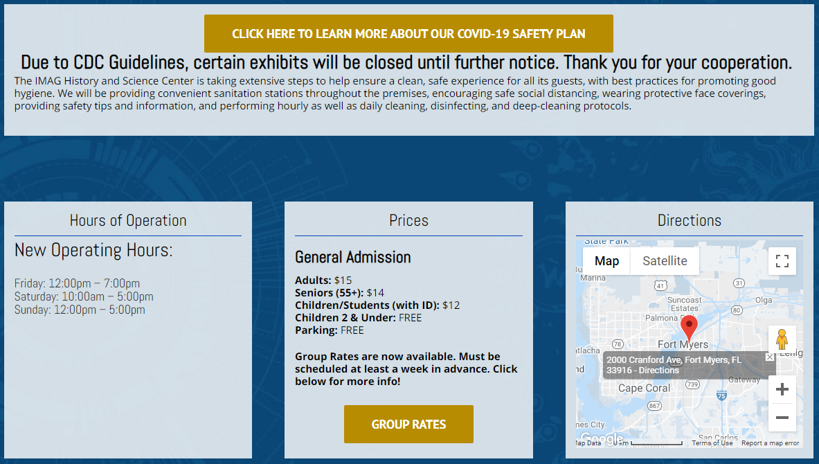 Fort Myers IMAG History & Science Center new hours and exhibit closure web page for COVID-19. There are new hours, groups must register at least a week in advance, and there are exhibits that are remaining closed until further notice.