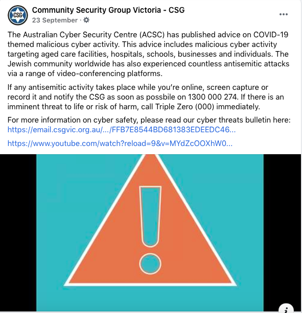 CSG shared information on facebook about the need to be careful around cyber security during Covid-19, when more people are online: "The Australian Cyber Security Centre (ACSC) has published advice on COVID-19 themed malicious cyber activity. This advice includes malicious cyber activity targeting aged care facilities, hospitals, schools, businesses and individuals. The Jewish community worldwide has also experienced countless antisemitic attacks via a range of video-conferencing platforms."