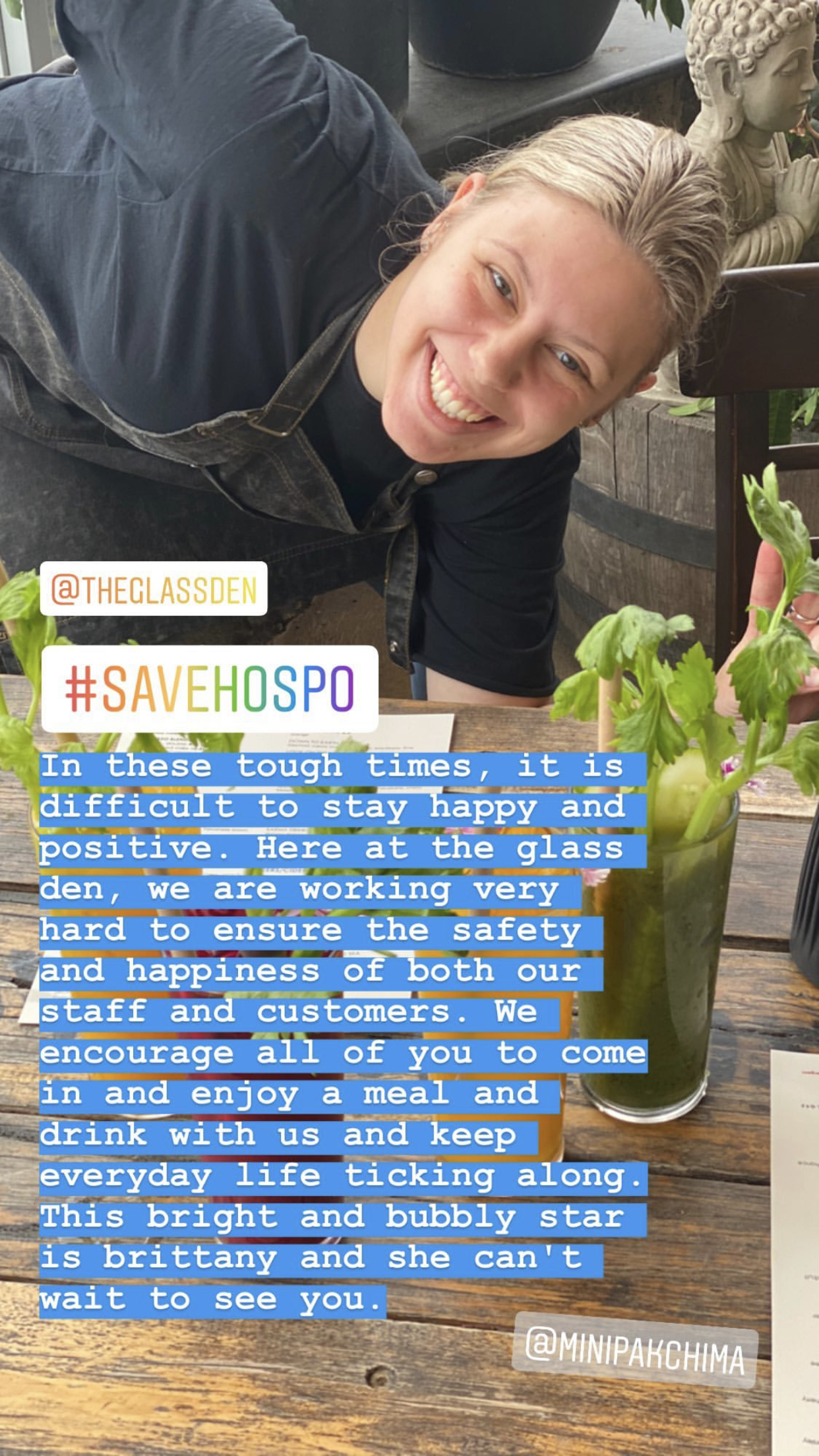 This image represents hospitality venues in Melbourne struggling to make ends meet earlier in the pandemic, before they were closed due to restrictions. The hashtag #savehospo trended on Instagram, being used by hospitality venues to ask for continued support from the public. This image is important to me as I am the worker in the background of the image. For me, the image represents my personal journey during the pandemic, where I lost my job and was unable to apply for Jobkeeper benefits as I got the job three weeks before restrictions were enforced. This photo gives insight into the struggle that a lot of hospitality venues and workers are going through during the pandemic.