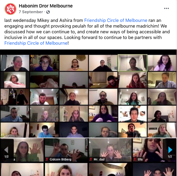 During lockdown, youth movements needed to move their programming online. In September the madrichim of Habonim Dror met for a peulah to learn about how to be inclusive of people with different needs: "last wedensday Mikey and Ashira from Friendship Circle of Melbourne ran an engaging and thought provoking peulah for all of the melbourne madrichim! We discussed how we can continue to, and create new ways of being accessible and inclusive in all of our spaces. Looking forward to continue to be partners with Friendship Circle of Melbourne!"
