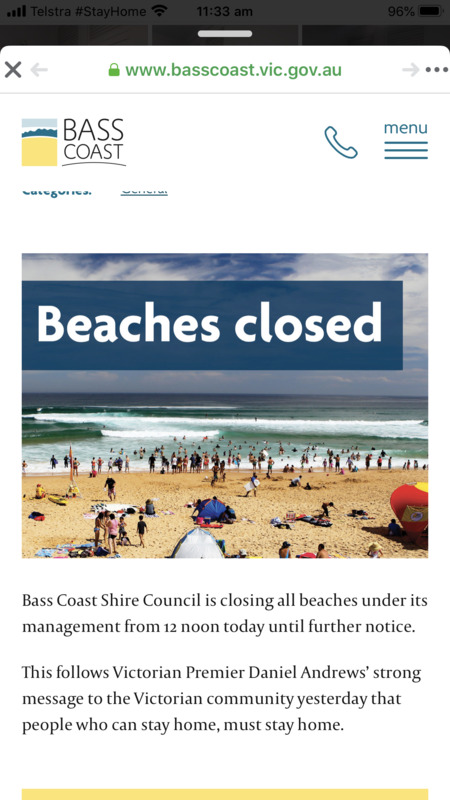 For part of the pandemic I spent time living in the Bass Coast Shire in South Gippsland. My friends and I often like to go for walks on the beach or go swimming. When the first announcement was made on March 28, we were still allowed to do these things. However, by the time Easter came, the shire was worried about visitors and social distancing, so they closed the beaches to all people for every purpose. As much as I understood the necessity of these actions, to me the beach is a good way to get some exercise and take care of my mental health. So, naturally I was quite disappointed when the beaches were closed.