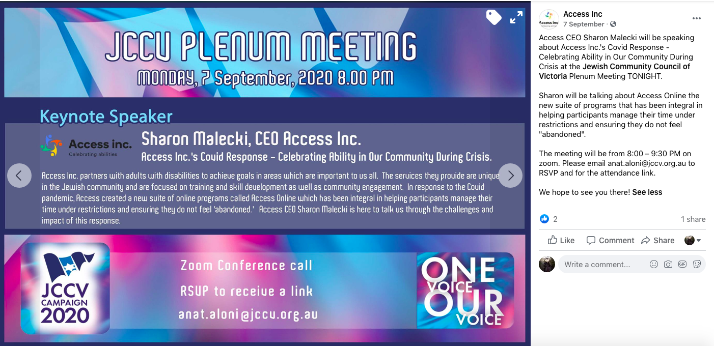 At each Jewish Community Council of Victoria (JCCV) plenum meeting they have a guest speaker. At their September plenum meeting, "Access CEO Sharon Malecki will be speaking about Access Inc.'s Covid Response - Celebrating Ability in Our Community During Crisis at the Jewish Community Council of Victoria Plenum Meeting TONIGHT.