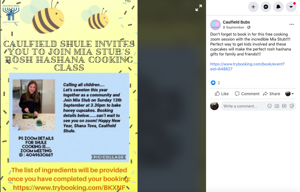 In the lead-up to Rosh Hashanah, Caulfield Bubs (a children's program run by Caulfield Shule) organised an online cooking class: "Don’t forget to book in for this free cooking zoom session with the incredible Mia Stub!!!! Perfect way to get kids involved and these cupcakes will make the perfect rosh hashana gifts for family and friends!!!"