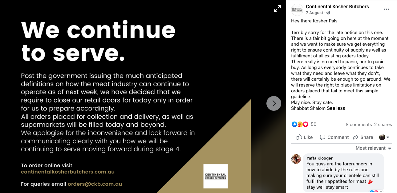 Continental Kosher Butcher shared information on their facebook page after the Victorian Government announced Stage 4 of lockdown, which involved restrictions on the meat industry, explaining some of the short-term impacts, but reassuring customers not to panic about supply.