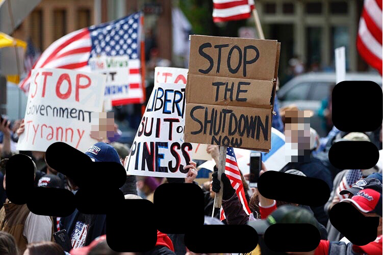 This redacted photo from the Associated Press covers anti-lockdown protests in Harrisburg, Pennsylvania on April 20, 2020. I redacted the original to protect the identities of the protestors. The crowd demanded the reopening of their state’s economy. Their demonstrations came on the heels of new social distancing measures to help diminish the spread of Covid-19. The article that accompanies this photo should be essential reading for both journalists’ safety and the public’s safety. The tips on protecting oneself in a violent crowd are widely applicable.