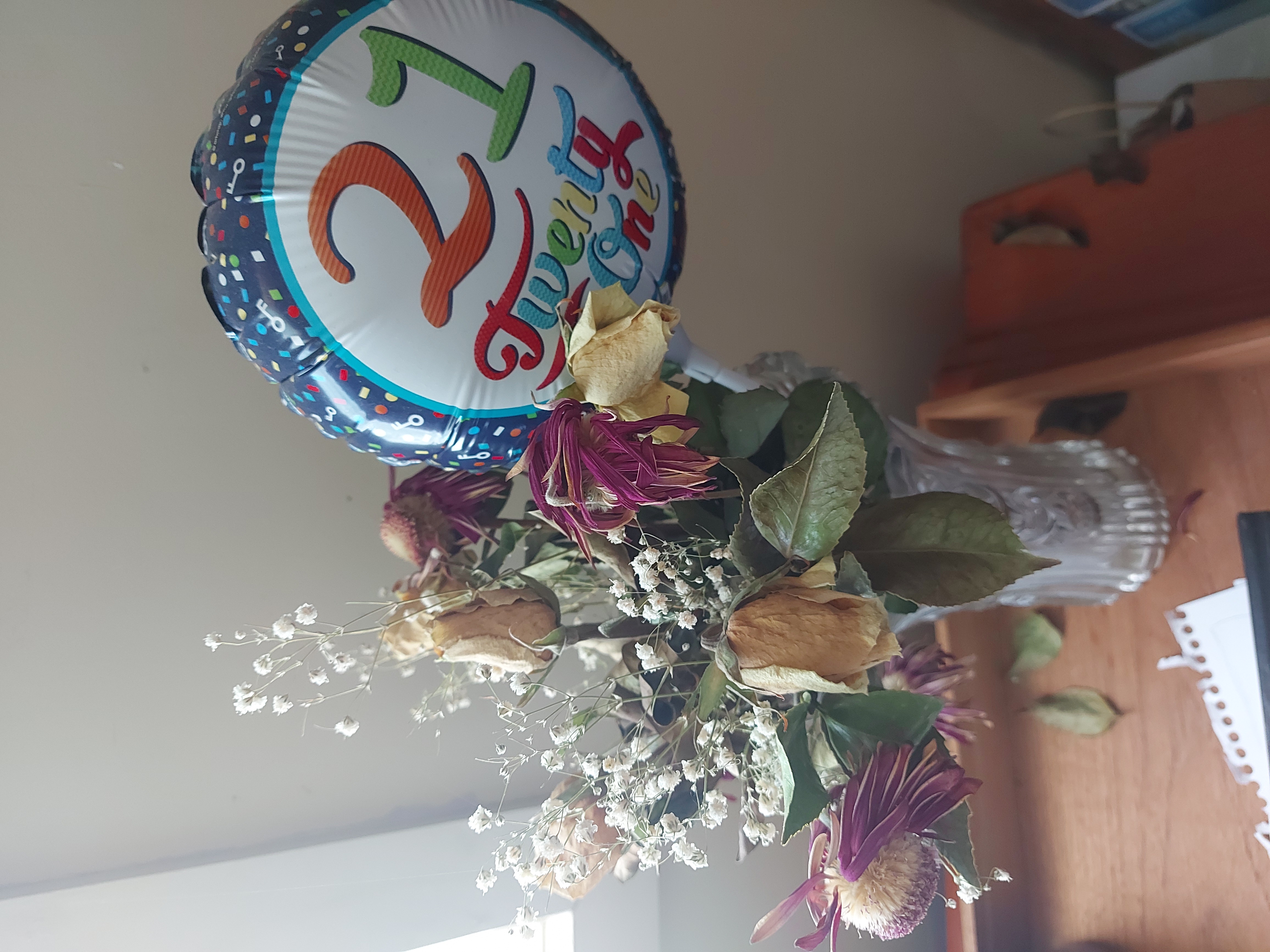 This is a photograph of a vase filled with dying flowers and a helium balloon with "21" on it. It is in my bedroom in Melbourne.