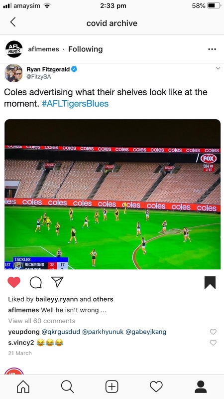 (HIST30060) As an avid footy fan, it was upsetting and very strange to see the 2020 AFL season starting without being able to attend the game at the MCG, or there be anyone in the seats when watching it on tv. This post reflects this strange moment in AFL history, but also the coinciding rush on supermarkets, particularly toilet paper, leaving lots of shortages and empty supermarket shelves. I still don't understand why seemingly everyone in Victoria and Australia decided they needed to stock up on toilet paper, but it was definitely an aspect of a very strange and stressful period at the start of the pandemic.
