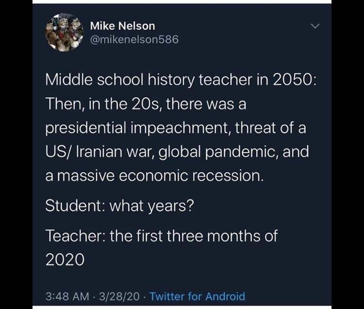 I am hoping to become a high school history teacher and this meme rang true for me. I cannot wait to teach 2020 to future students, it will probably be a class in itself!