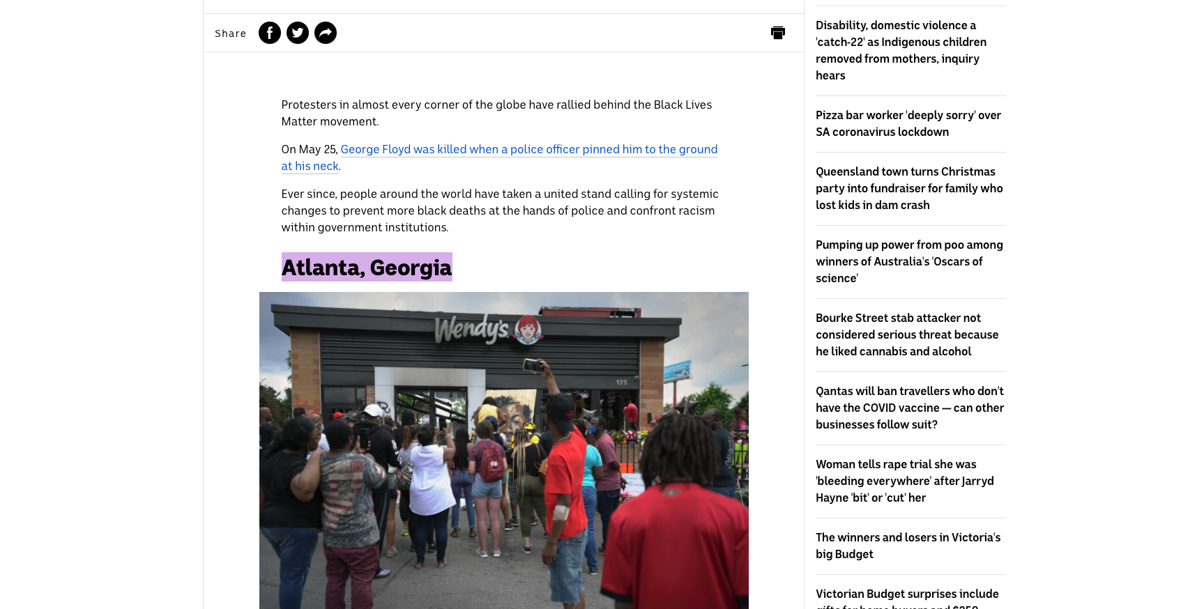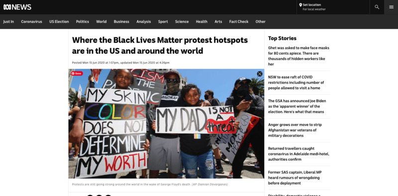This photo and article are about the Black Lives Matter movement; specifically which places in the world are experiencing high levels of protests. The event is occurring during the COVID-19 pandemic, demonstrating the importance of social justice during a pandemic. I censored the face of the children as an assignment regarding privacy and ethics.