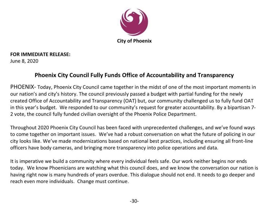 This statement explains how the voice of the people who want justice have been heard. The mayor in her statement is explaining how the office of accountability was only partially funded before but is now being fully funded. This means that all police officers in the Phoenix area will be required to wear a body cam so they are monitored and watched.
