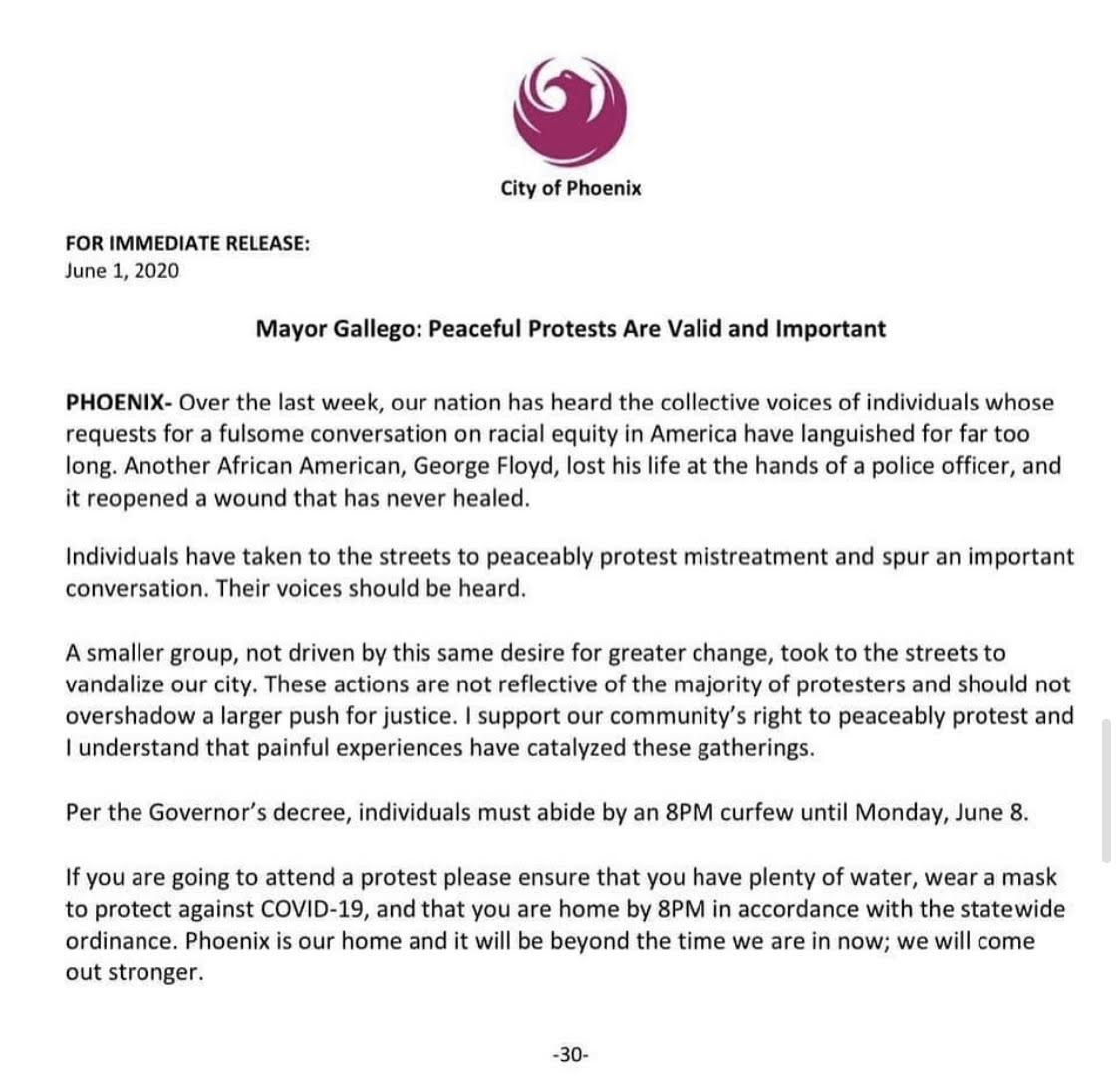 This screenshot is a statement that was released by the Mayor of Phoenix during the Black Lives Matter movement. In this statement the mayor explains how she is on their side and supports the peaceful protests for social justice. She also goes on to explain that the groups that are rioting and looting the city are not affiliated with those who are peacefully protesting, those are two separate groups.