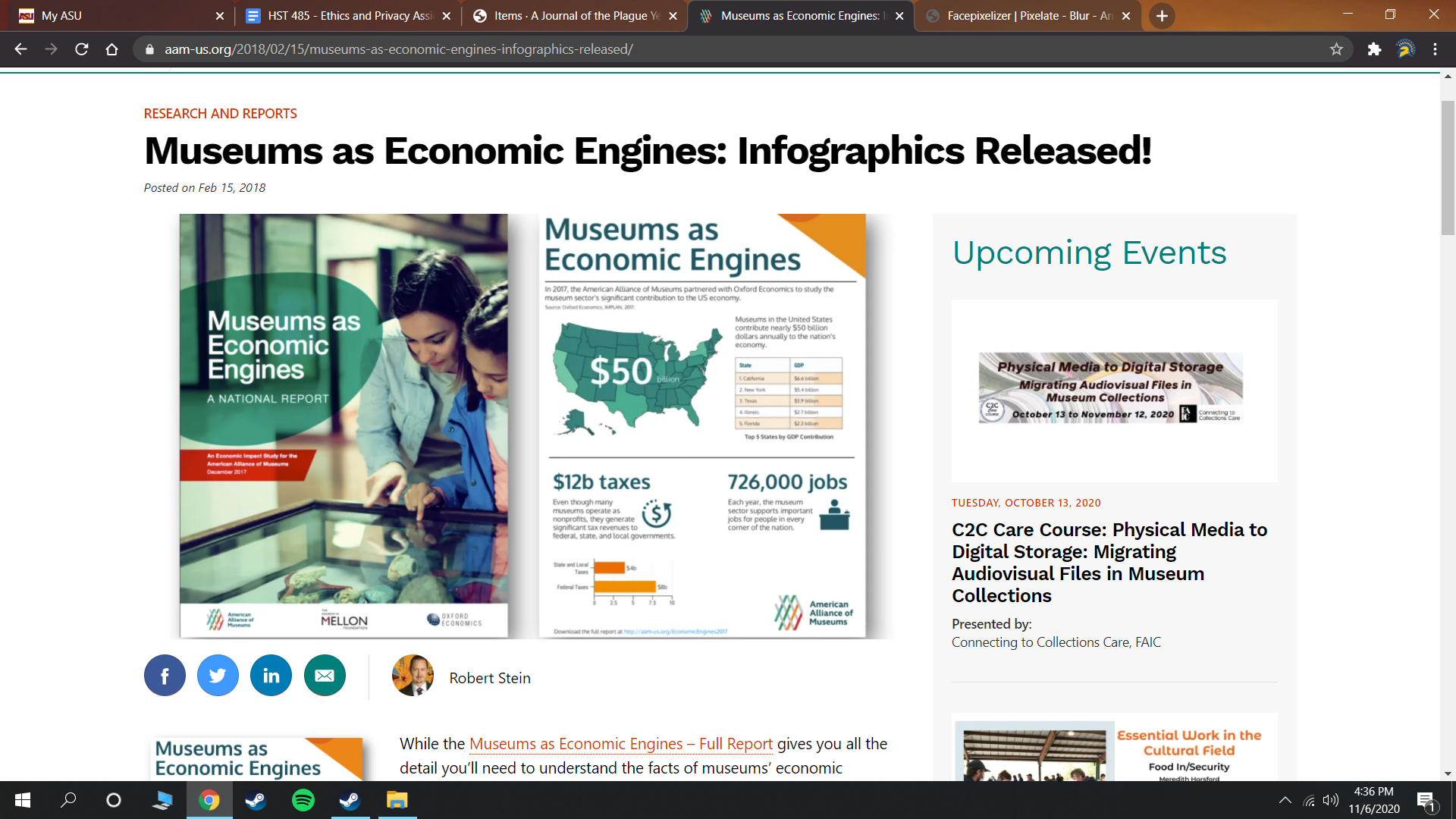Though created in 2018, the American Alliance of Museums created multiple infographics on the economic activity and contribution of museums in several states. I have been searching for multiple ways to bring awareness to preserving museums in the midst of the major pandemic and infographics are very informative and provide information in an organized and enjoyable way!
