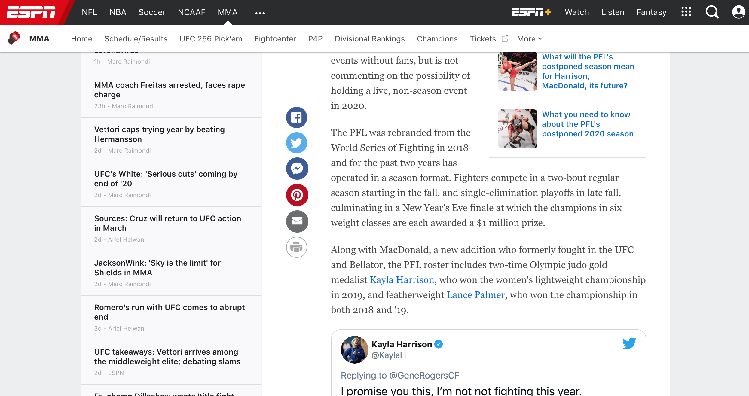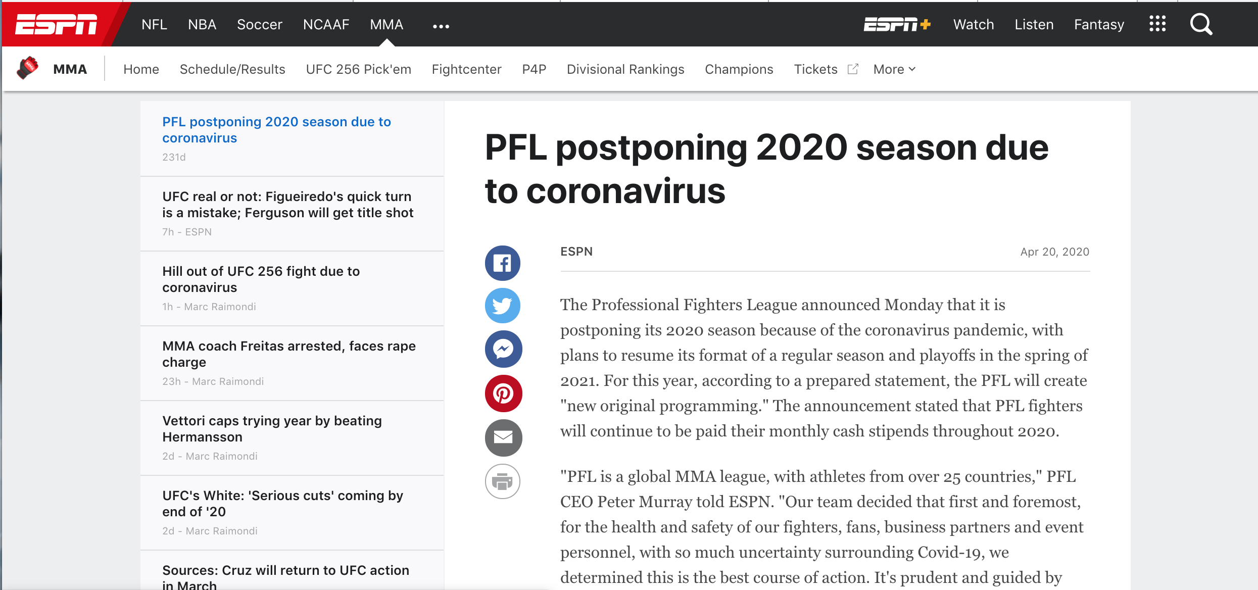 The Professional Fighters League (PFL) is a relatively new MMA promotion that started in 2018. It treats MMA like other sports and has a regular season, post-season, and championship. PFL had to postpone their season this year due to the coronavirus. They did agree to continue giving the fighters on their roster their monthly stipends despite not being able to put on any fights. This decision was originally made in April and the 2020 season has still not started in November.