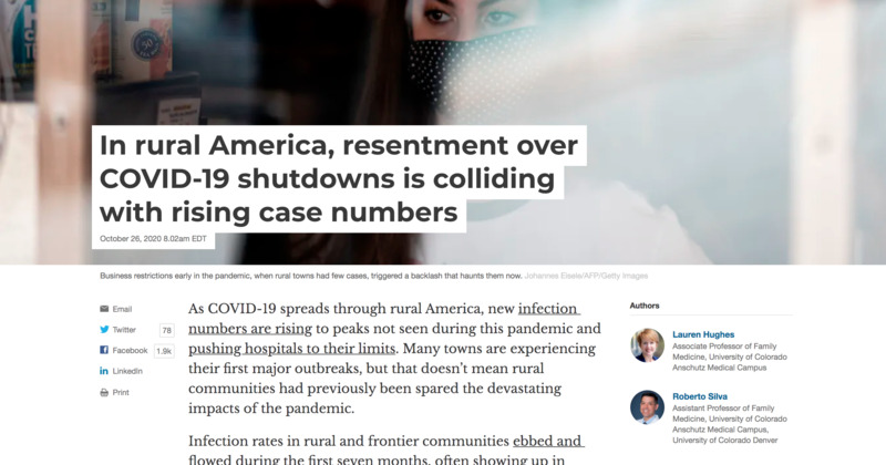 This article is highly interesting because it discusses the supposed political side of covid and its supposed effect on rural communities, rise in numbers, and the overall function of these rural communities.